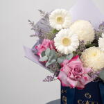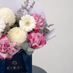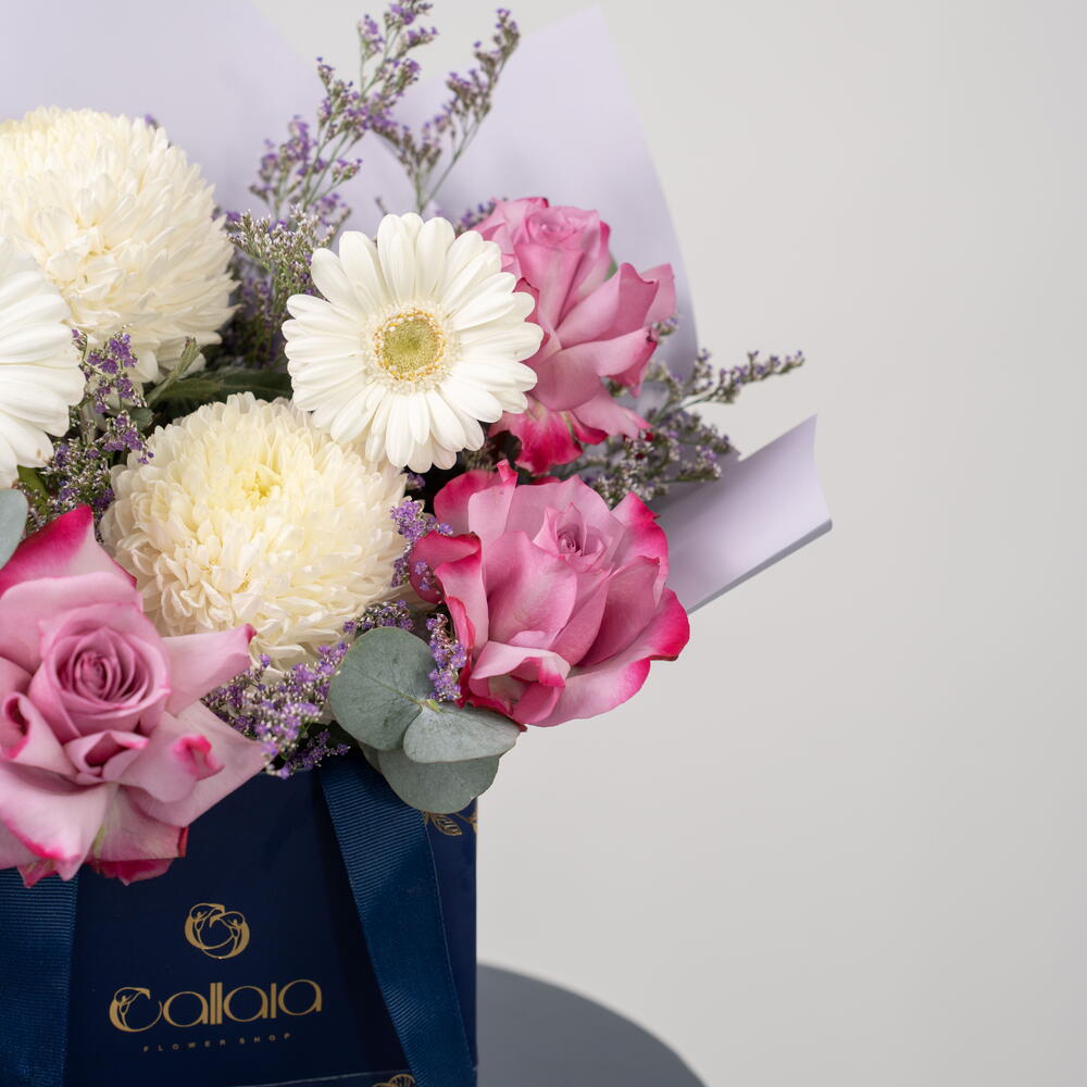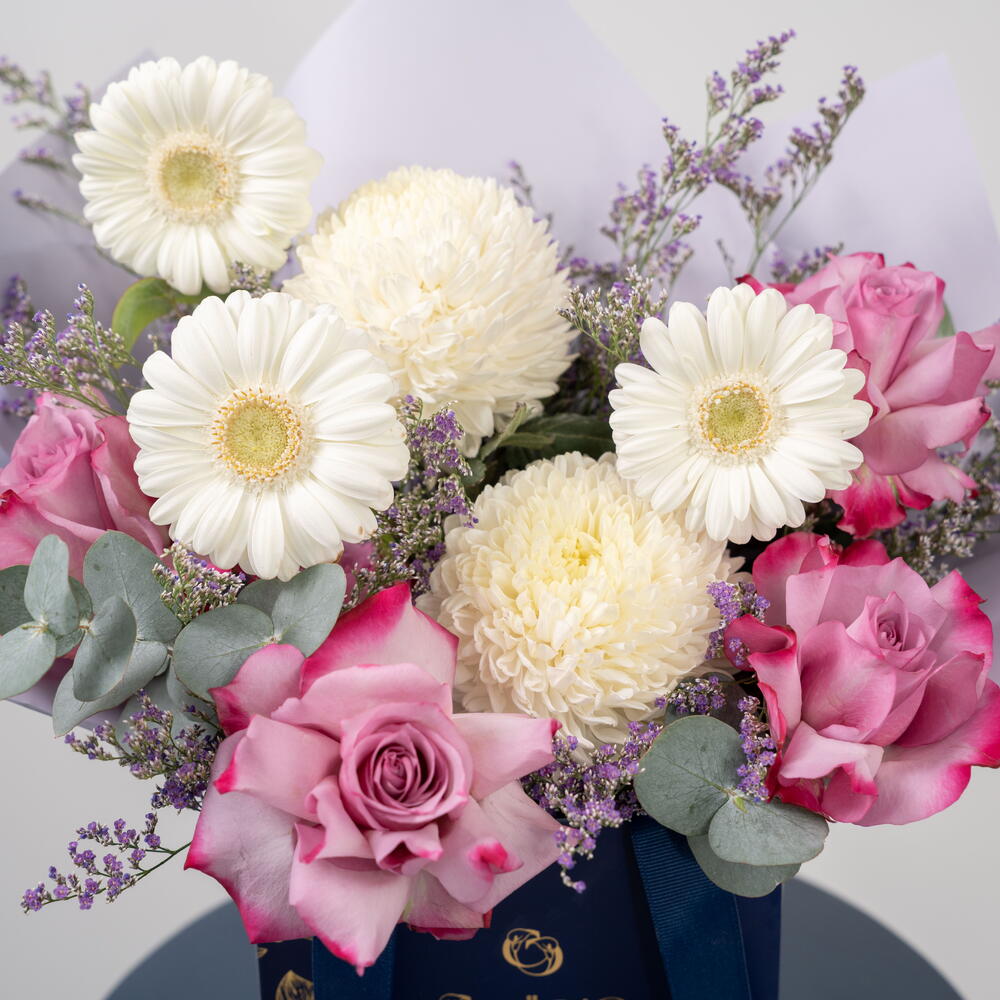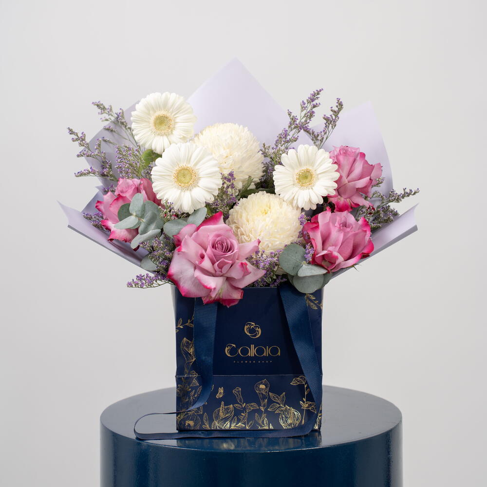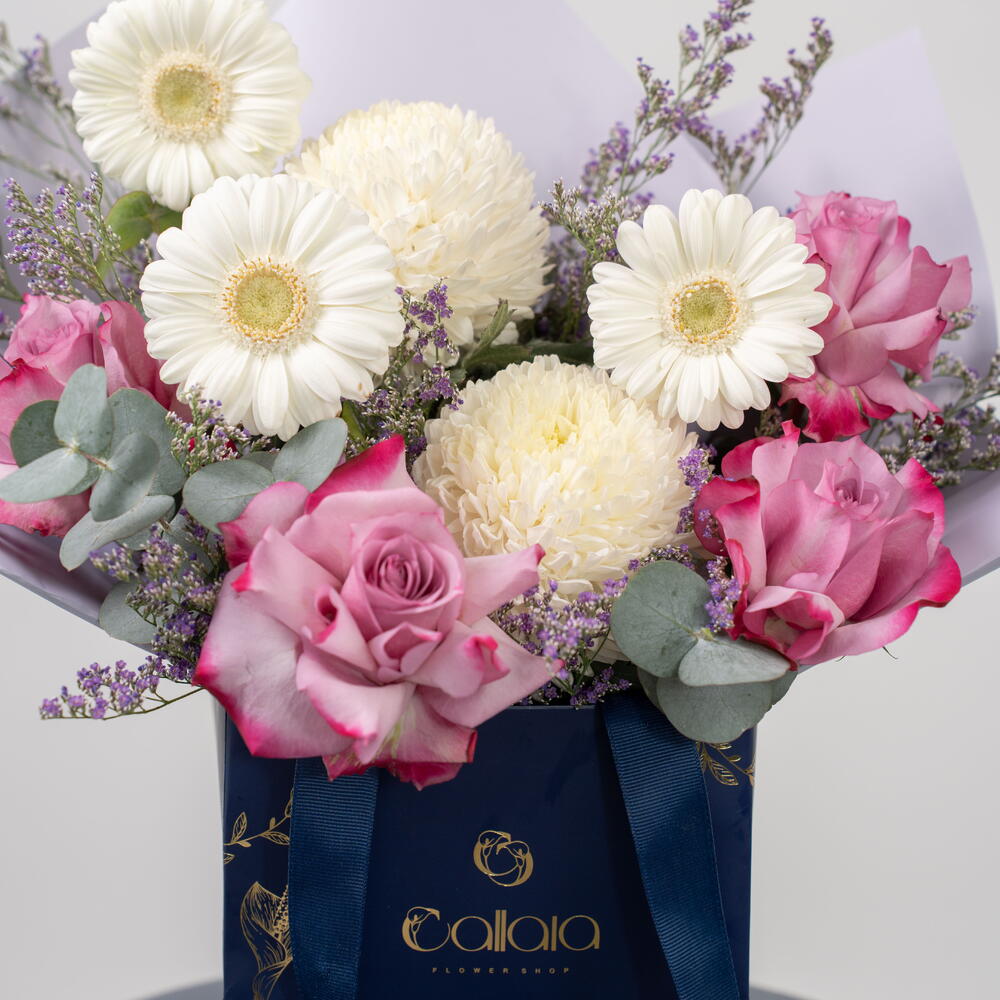 Découvrez Douce Sérénité, une délicate composition florale aux teintes pastel, conçue pour exprimer pureté, amour et sérénité. Cette création florale comprend : Des gerberas ivoire tendres Des chrysanthèmes blancs duveteux Des roses roses de qualité supérieure Du statice lilas De l'eucalyptus frais Présentée dans l'élégant coffret bleu marine et or signature de Callaia, cette composition allie une douce féminité à une élégance moderne, idéale pour les anniversaires, les remerciements, les anniversaires de mariage, les fêtes de naissance ou tout simplement pour égayer la journée de quelqu'un. Un bouquet apaisant, créé pour sublimer chaque instant.