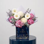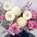 rose violet foncé - 4 pce Limonium - 1 pce germini blanc - 3 pce chrysanthème pivoines blanc - 2 pce