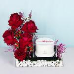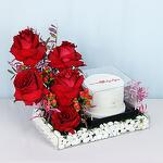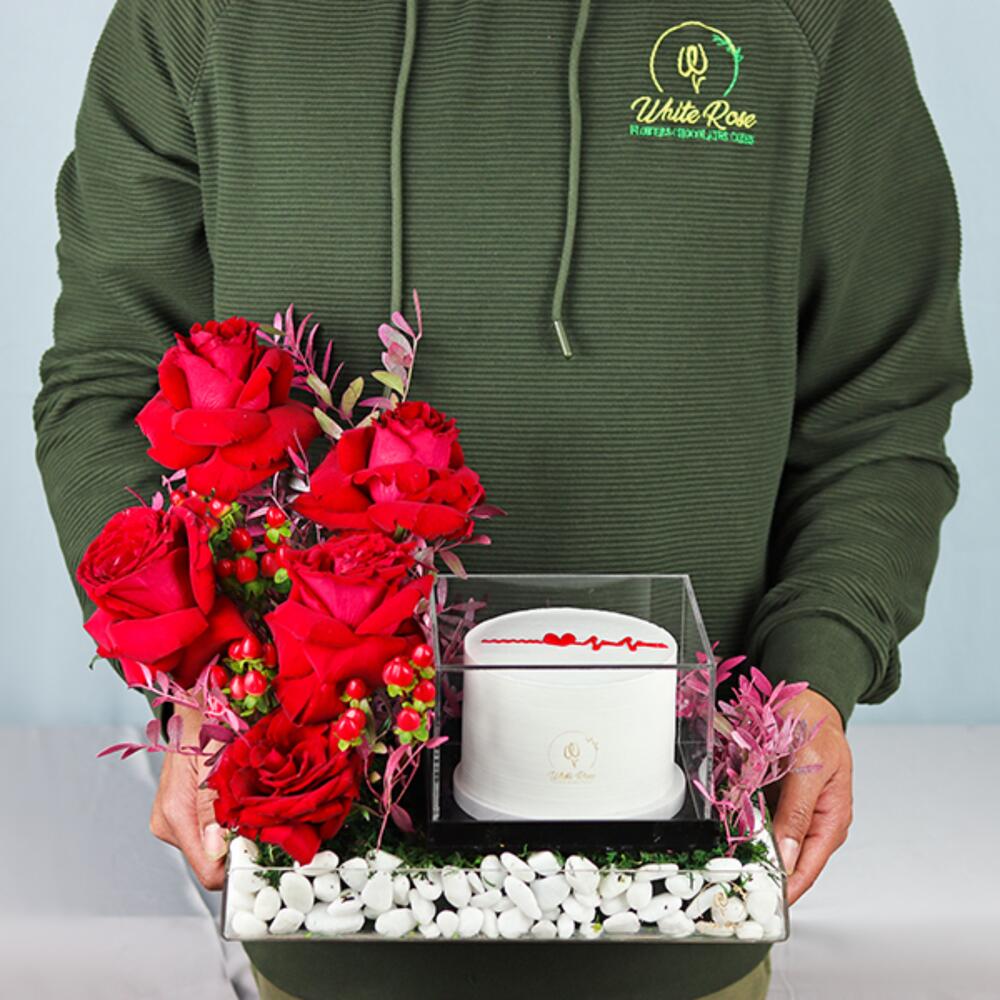 Roses rouges arrangées avec un gâteau de 300 g dans une boîte