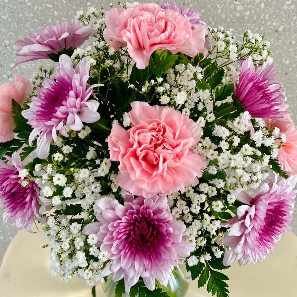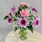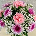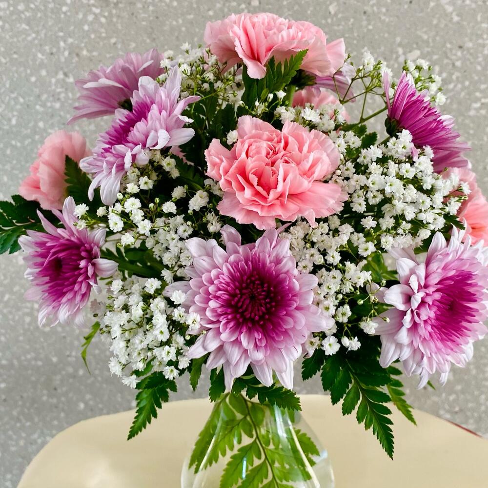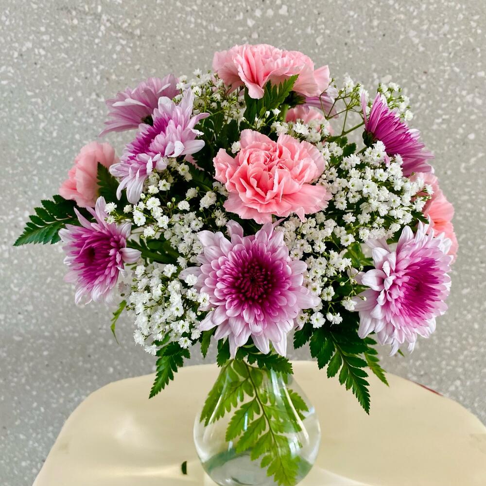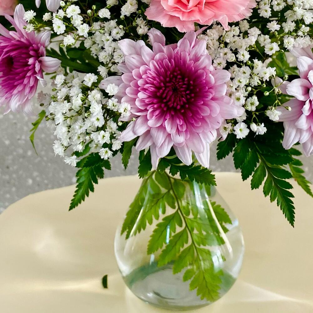œillets roses - 5 pce baby breath - 3 pce chrysanthème violet - 3 pce ruscus leaves - 3 pce fougère cuir - 5 pce mini-vase - 1 pce