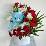 1 arrangement avec un petit ours en peluche bleu, 17 roses rouges, 3 chrysanthèmes blancs et des feuilles de saison