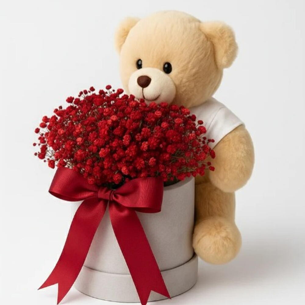 Le duo le plus mignon qui soit ! 💫 Découvrez notre adorable petit ourson tout doux, qui se détend avec une boîte de gypsophile. Ce petit trésor est prêt à faire fondre les cœurs et à illuminer les visages, que ce soit pour fêter une naissance, un anniversaire ou simplement pour offrir un peu de joie. Emballé avec soin, ce cadeau fera craquer tout le monde. Car câlins d'ourson + fleurs = magie. Choisissez l'option de texte personnalisé sur le t-shirt de l'ourson (pour les commandes passées 24 heures à l'avance).