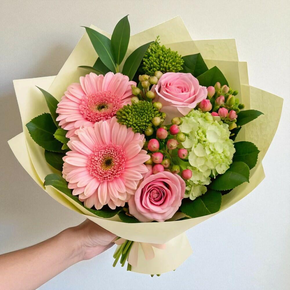 Ce bouquet vibrant associe des gérberas rose pâle, des roses délicates et des hortensias frais à des baies d'hypericum espiègles et à un feuillage luxuriant. Le mélange de tons roses pastel et de verts crée une apparence rafraîchissante et joyeuse, ce qui le rend parfait pour les anniversaires, les célébrations ou simplement pour égayer la journée de quelqu'un. L'équilibre des textures — de la douceur des roses à la silhouette structurée de l'hortensia et de la gérbera — ajoute de la profondeur et de l'élégance. Pour garder le bouquet frais, coupez les tiges en biais tous les deux jours, changez l'eau régulièrement et placez les fleurs dans un endroit frais à l'abri de la lumière directe du soleil. Ce bouquet rayonne de joie, d'amour et de tendresse, ce qui en fait un cadeau merveilleux pour tout moment spécial.