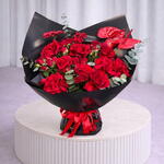 Eucalyptus - 2 pce anthurium rouge - 2 pce spray de roses rouges - 10 pce rose rouge premium - 9 pce gérbera rouge - 2 pce