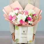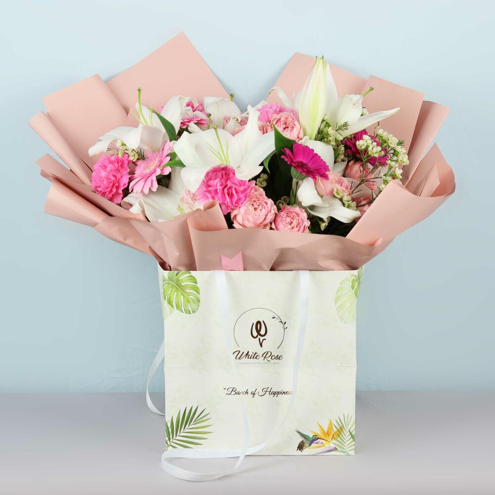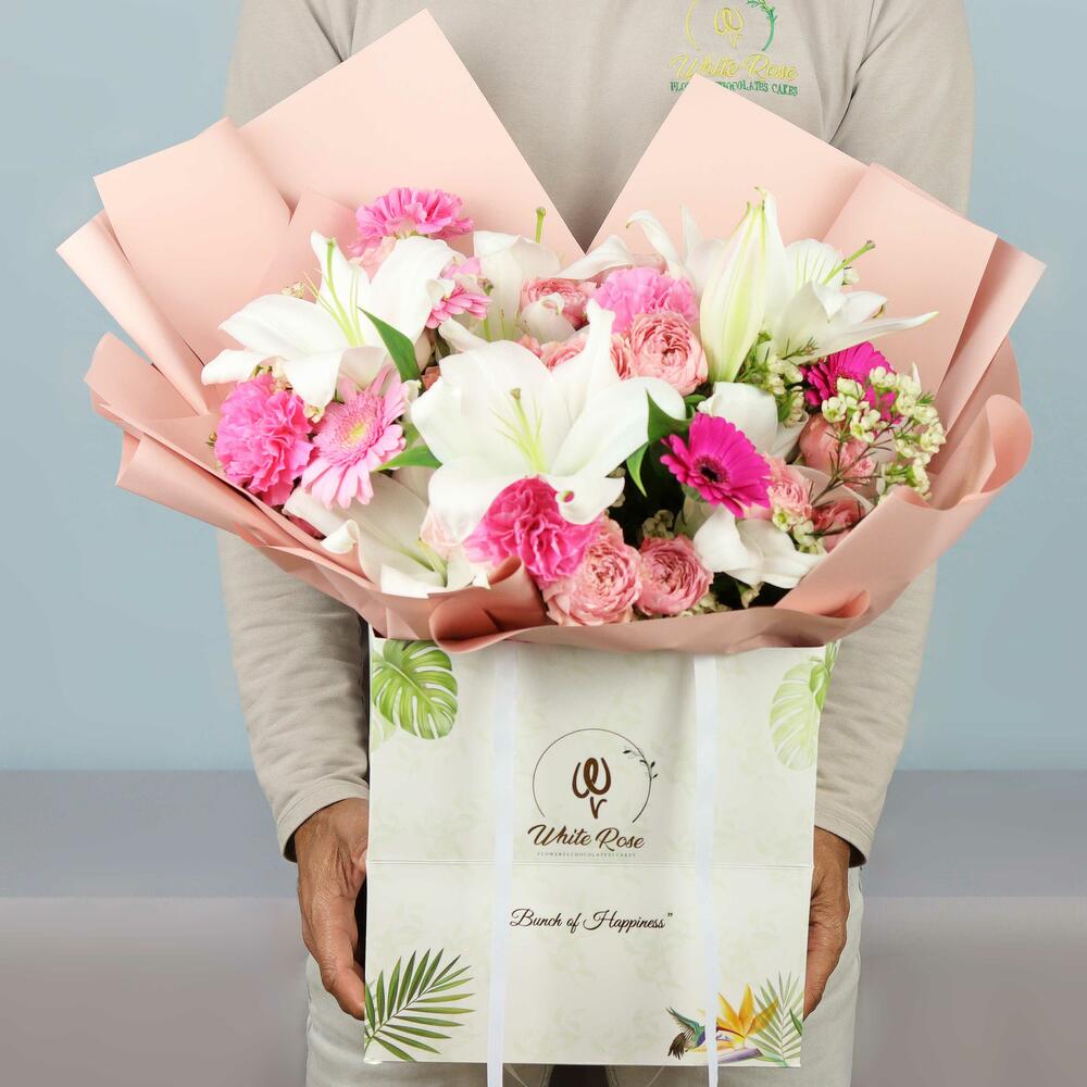 a bouquet with Combination of Garbera, Lily , carnation and other mix of flowers in a bag