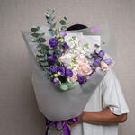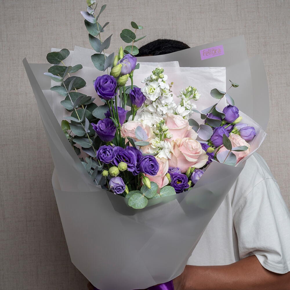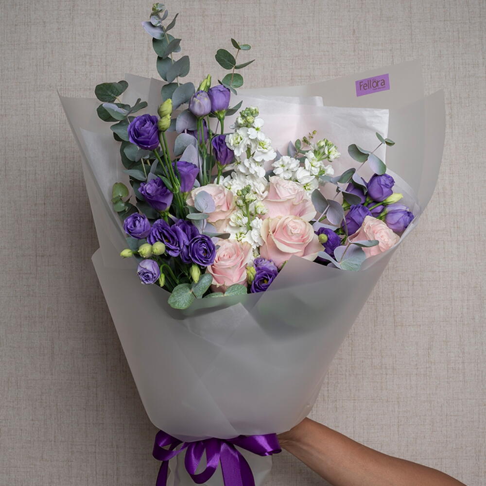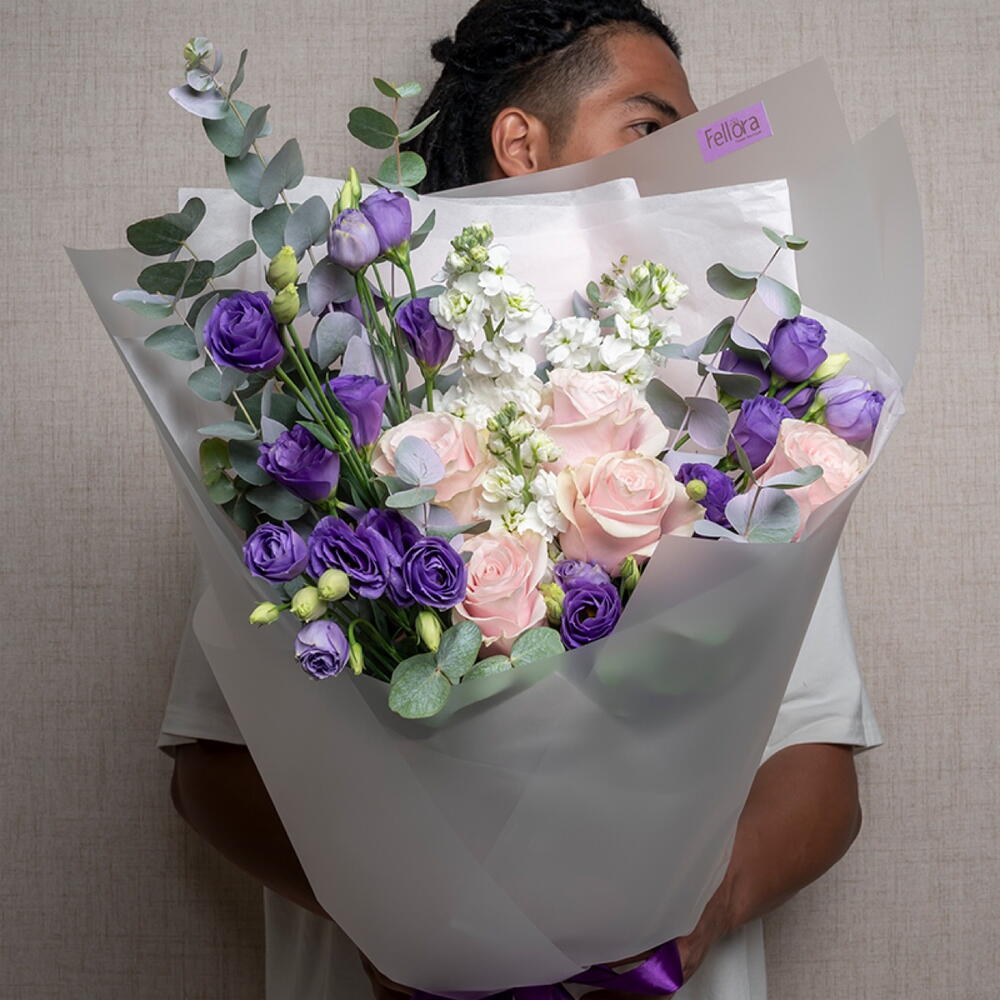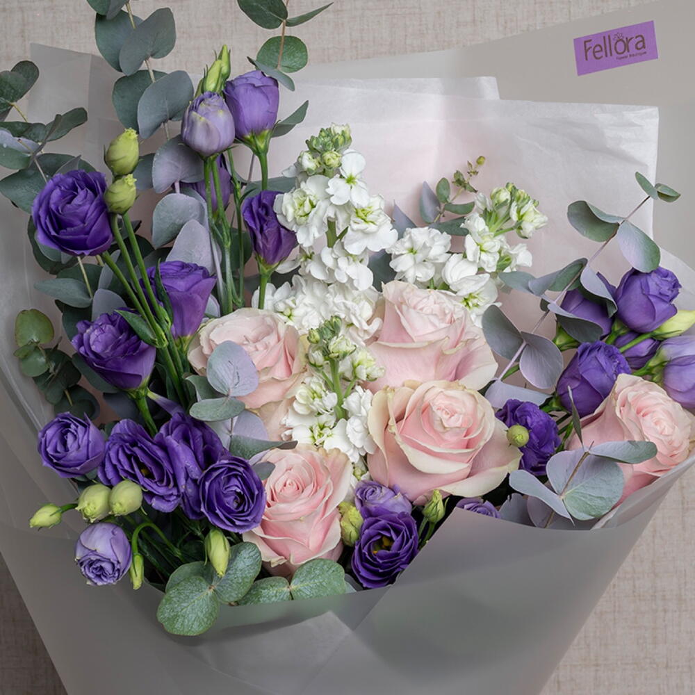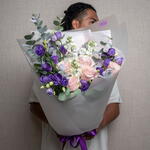 Lisianthus - 6 pce rose - 5 pce matthiola - 5 pce ribbon satin - 1 pce eucalyptus leaves - 5 pce emballage transparent - 4 pce