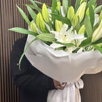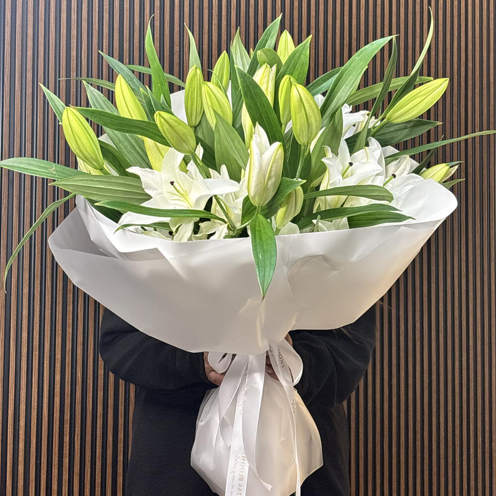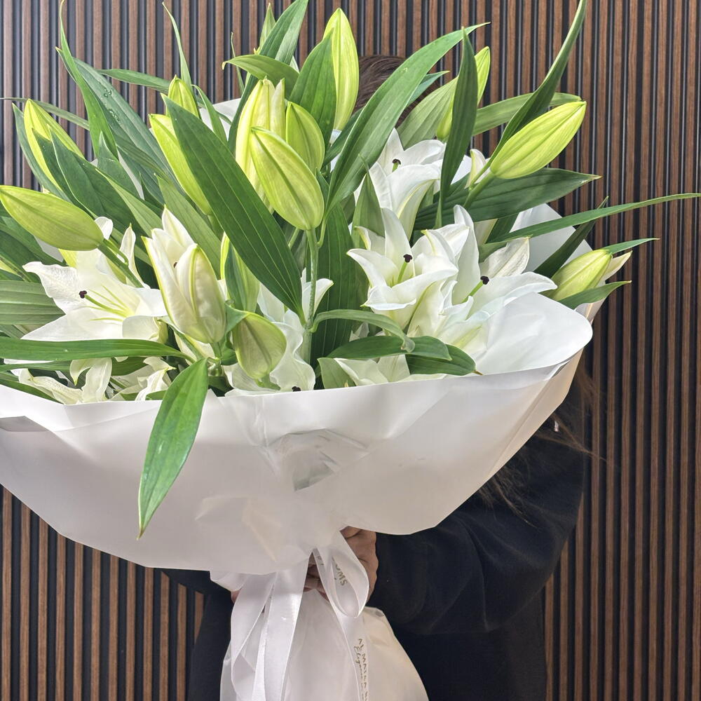 A striking display of purity and modern elegance, this arrangement features premium Holland white lilies. The bouquet is masterfully structured to showcase the architectural beauty of the blooms, transitioning from tightly furled green buds to full, snow-white petals. Wrapped in sculptural white paper and finished with a branded satin ribbon, it offers a sophisticated, monochromatic aesthetic that complements any high-end interior.