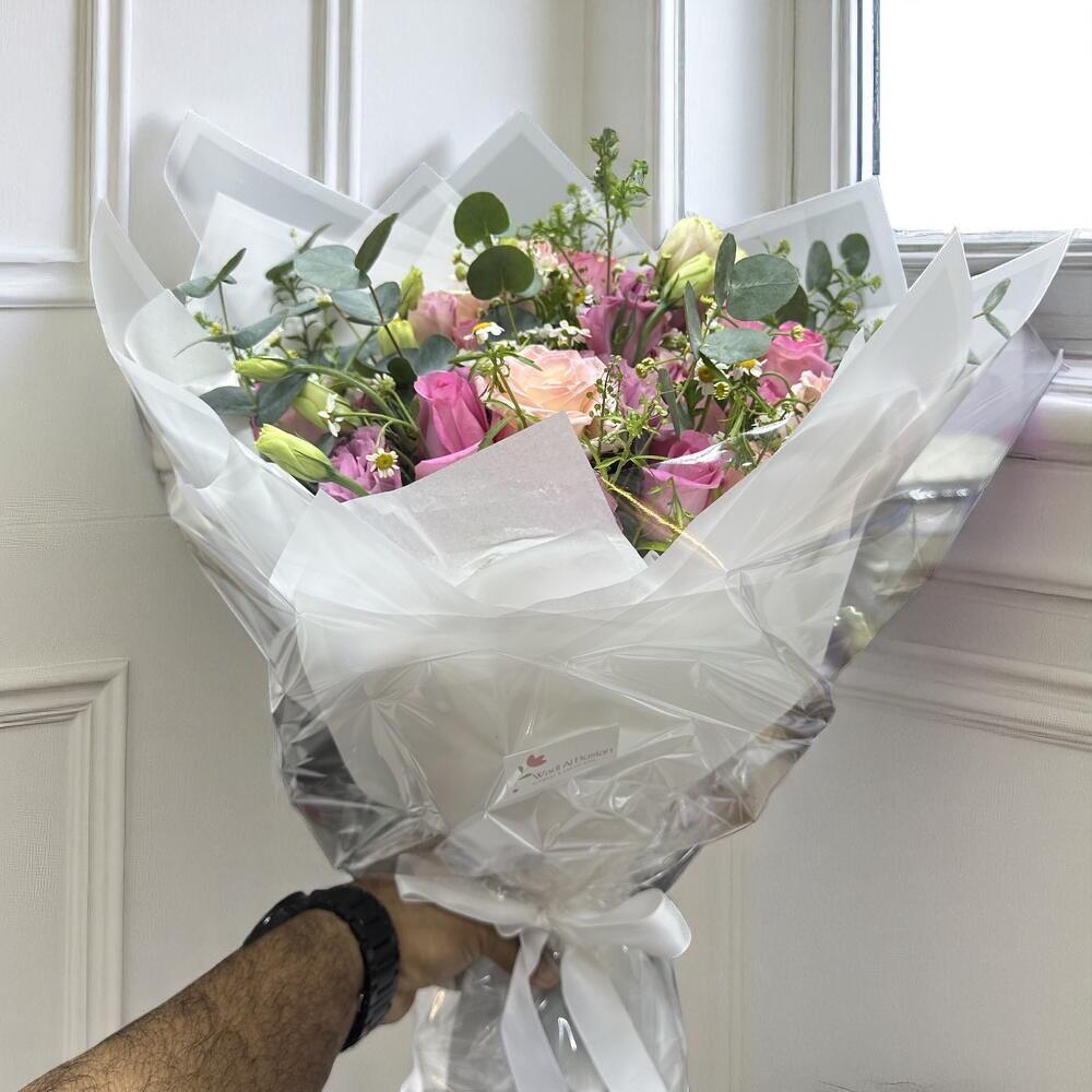 Eucalyptus - 11 pce Pink rose - 11 pce rose pâle - 9 pce lipidium - 9 pce licianthus rose - 5 pce