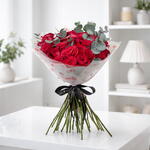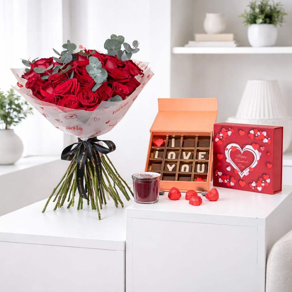 35 roses rouges de qualité supérieure, symbolisant un amour profond et une passion éternelle. Agrémentées de 5 tiges de feuilles d'eucalyptus fraîches pour une touche raffinée et contemporaine. Magnifiquement emballées dans du papier cadeau à motifs de cœurs. Accompagnées d'une charmante sélection de chocolats « Je t'aime » pour une douce déclaration d'amour. Le tout est complété par une luxueuse bougie parfumée en pot.