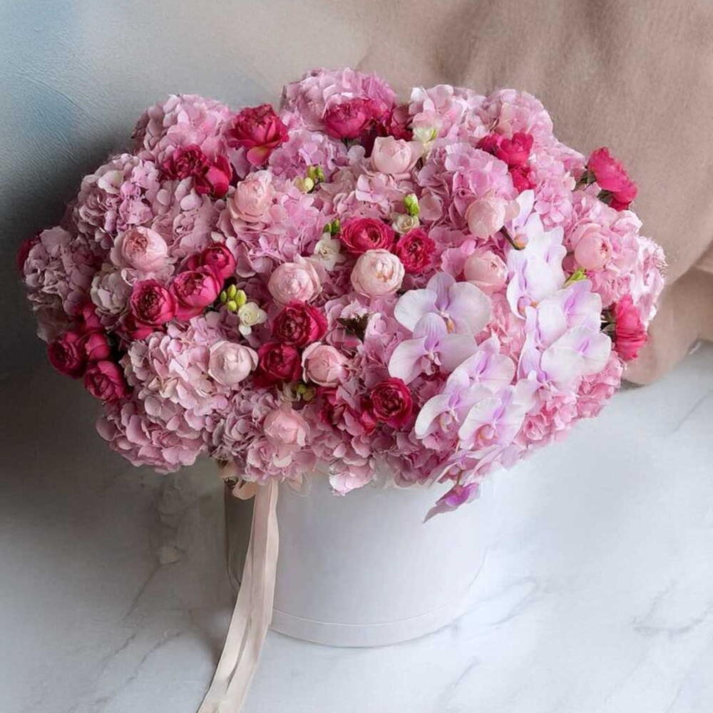 Offrez-vous l'éclat éblouissant de notre arrangement Flowers in a Box, exquisément conçu pour enchanter vos sens. Il comprend 2 délicates Phalaenopsis, apportant une note d'élégance raffinée. Pour les accompagner, 40 hortensias vifs, dansant dans une magnifique explosion de couleur. Nichées parmi eux se trouvent 20 roses de jardin d'un rose foncé et riche, chatouillant par leurs pétales de velours. Elles sont parfaitement assorties à 20 roses de jardin roses, chacune s'épanouissant délicieusement pour apaiser vos sens. Envoûtant et ensorcelant, cet arrangement Flowers in a Box est en effet une vision du plus bel art de la nature.