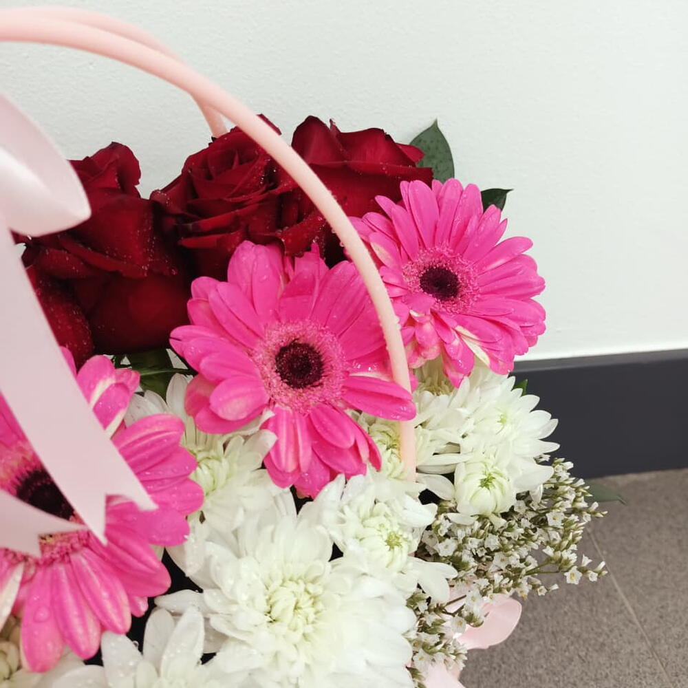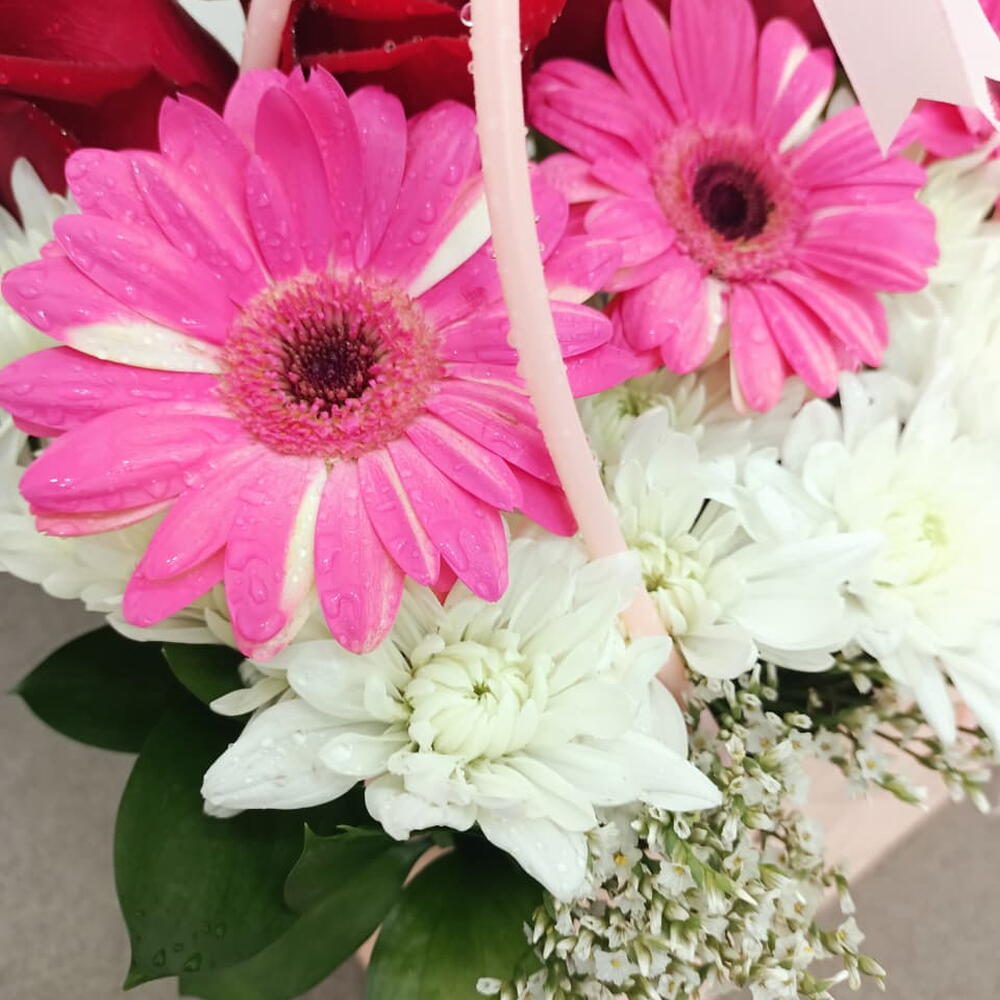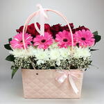 Cette composition moderne est présentée dans un sac cabas matelassé rose poudré unique, avec des anses supérieures élégantes et un nœud en satin. Elle présente un design superposé saisissant : une base de délicates gypsophiles blanches, une rangée centrale de chrysanthèmes d'un blanc pur, une touche vibrante de gerberas rose vif, et un arrière-plan de roses d'un cramoisi profond.
