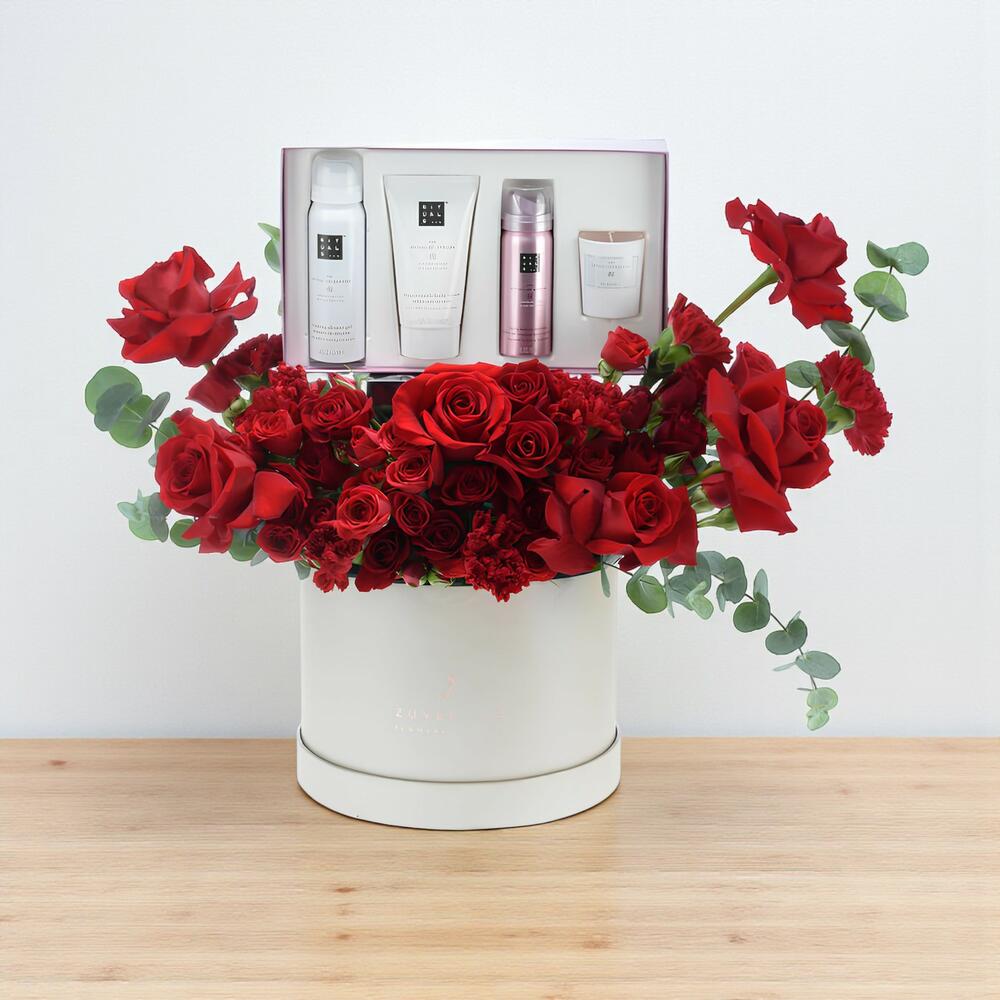 Eucalyptus - 3 pce œillets rouges - 7 pce red roses - 6 pce roses branchues rouges - 7 pce le petit coffret cadeau Rituals - 1 pce