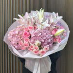 A breathtaking achievement in floral volume and tonal depth, this arrangement is the ultimate expression of luxury in pink. Grand Oriental lilies provide a majestic framework for cloud-like clusters of pink hydrangea, creating a rich, textured base. The heart of the bouquet is filled with the classic elegance of Revival pink roses and the delicate charm of Dinara spray roses. Wrapped in signature sculptural blush paper and finished with a branded satin ribbon, this bouquet offers a grand, multi-dimensional silhouette perfect for life’s most significant celebrations.