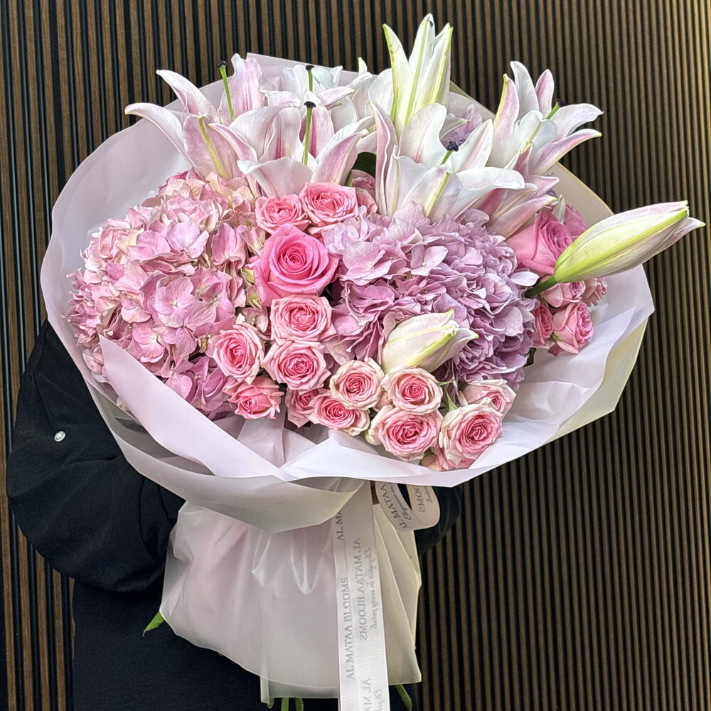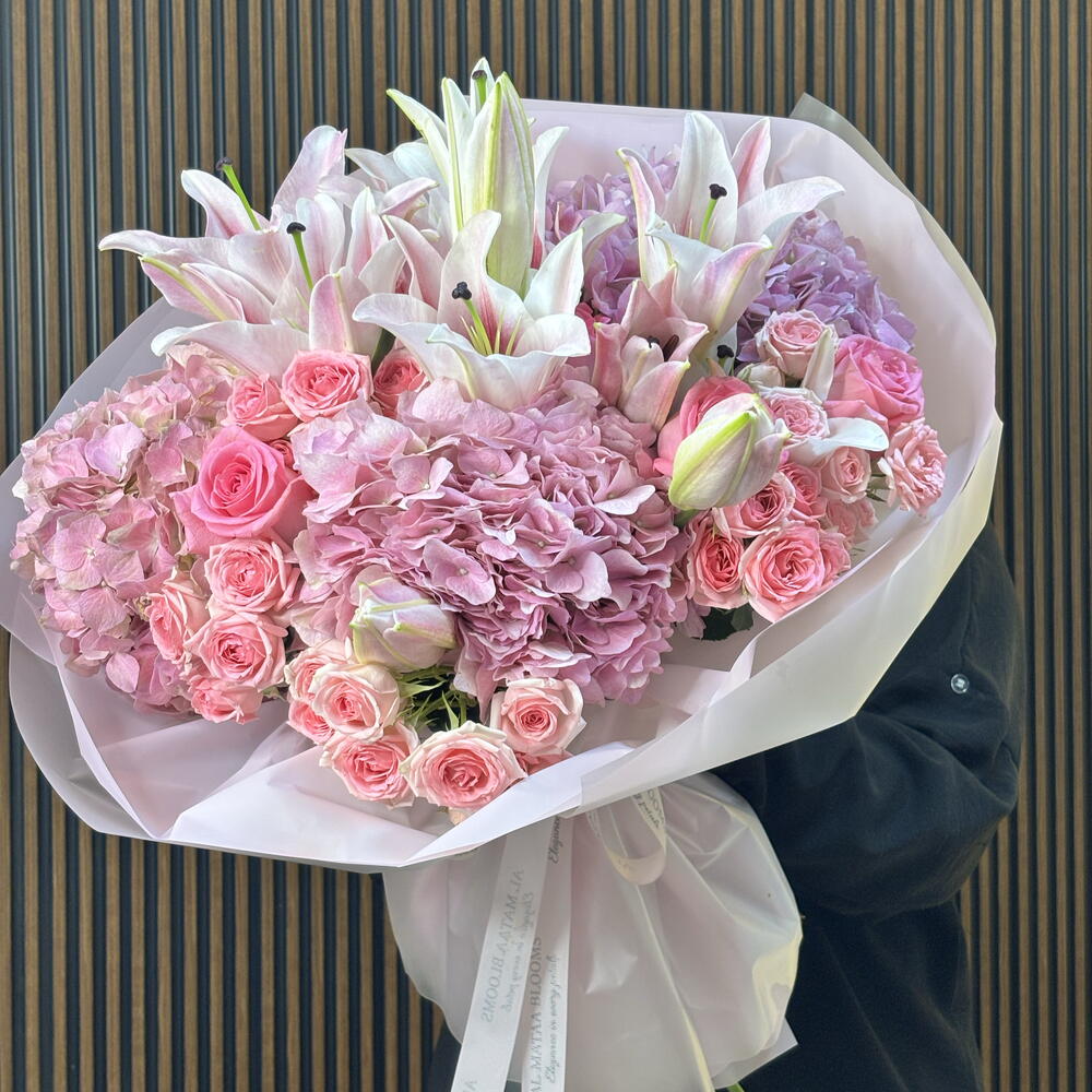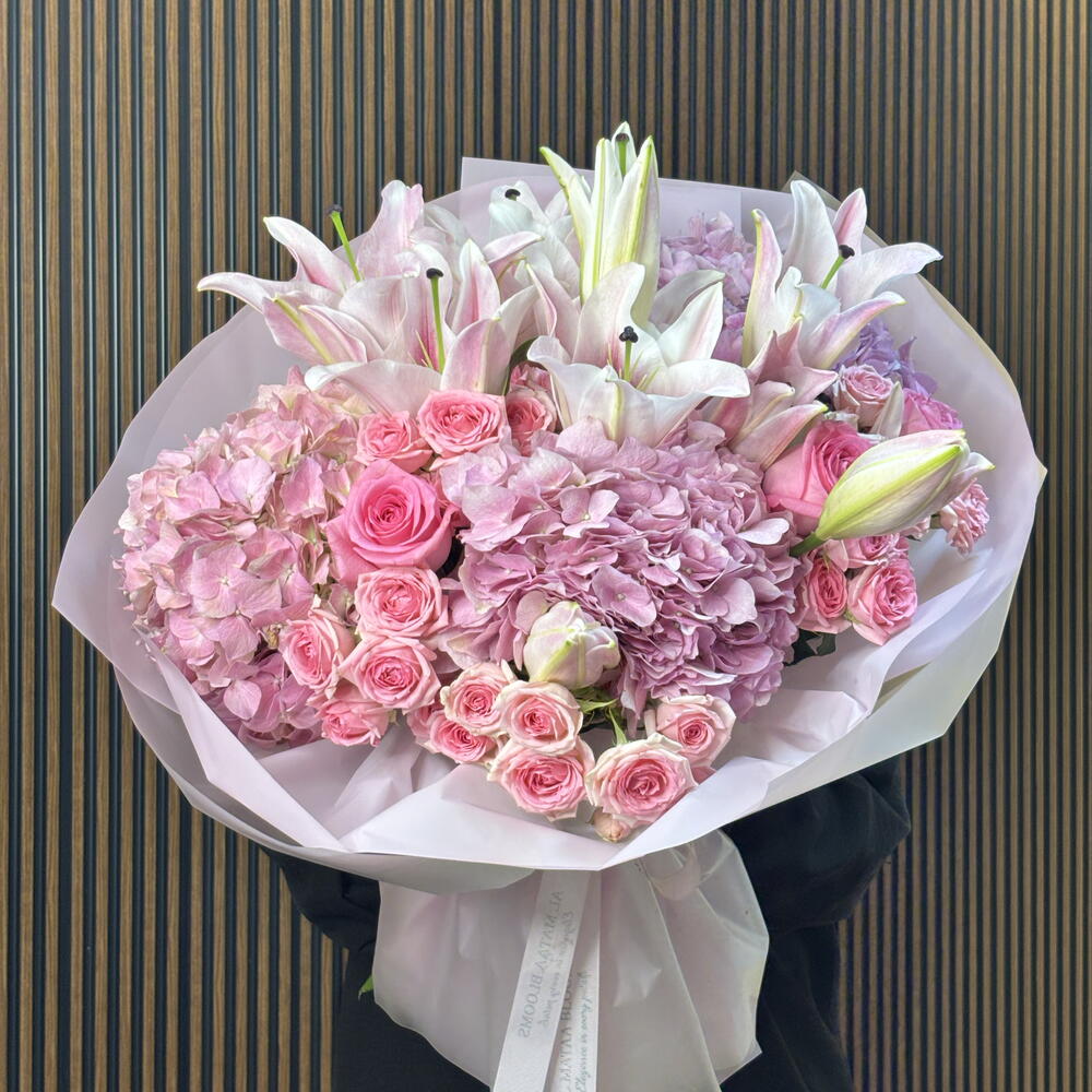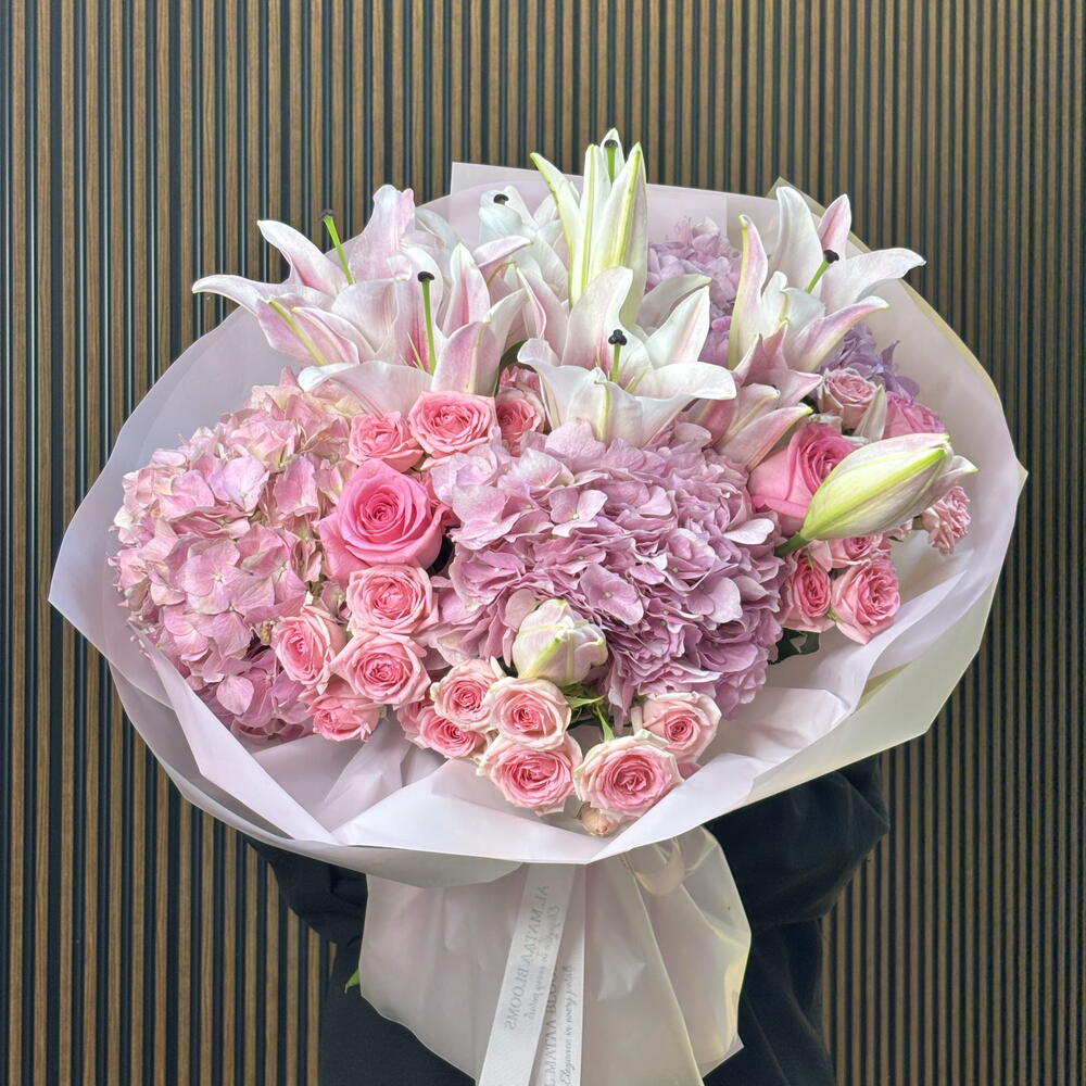 A breathtaking achievement in floral volume and tonal depth, this arrangement is the ultimate expression of luxury in pink. Grand Oriental lilies provide a majestic framework for cloud-like clusters of pink hydrangea, creating a rich, textured base. The heart of the bouquet is filled with the classic elegance of Revival pink roses and the delicate charm of Dinara spray roses. Wrapped in signature sculptural blush paper and finished with a branded satin ribbon, this bouquet offers a grand, multi-dimensional silhouette perfect for life’s most significant celebrations.