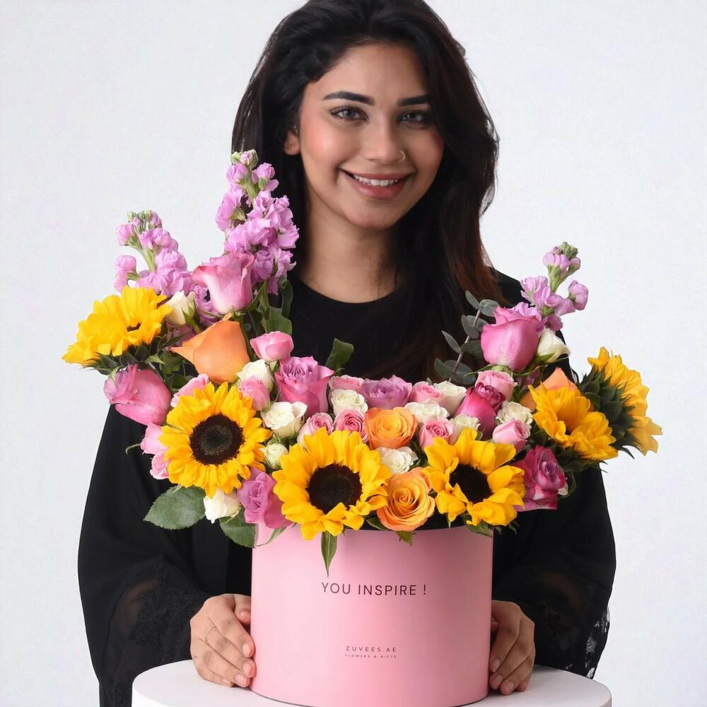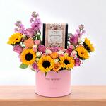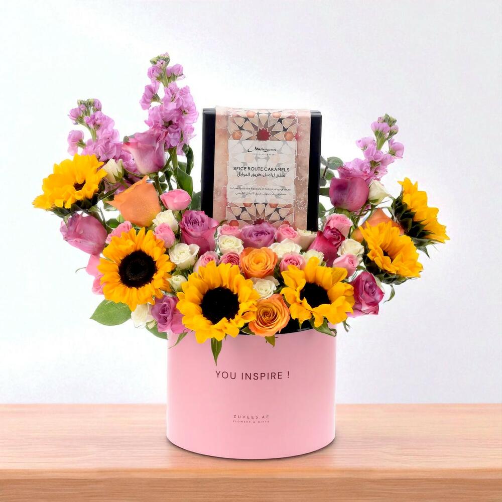 Fêtez la chaleur, l'élégance et la douce gourmandise avec le Sunbeam Garden Mirzam Combo — une composition florale radieuse accompagnée des caramels artisanaux Mirzam Spice Route. Débordant de tournesols joyeux et de roses aux teintes profondes, cet Inspire Box apporte charme et délices gourmands en une seule et magnifique surprise.