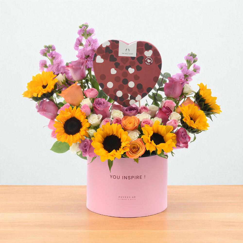 tournesols - 6 pce roses orange - 4 pce roses violettes - 8 pce roses branchues roses - 4 pce roses spray blanches - 4 pce mathiola rose - 3 pce Coffret cadeau cœur The Body Shop - 1 pce