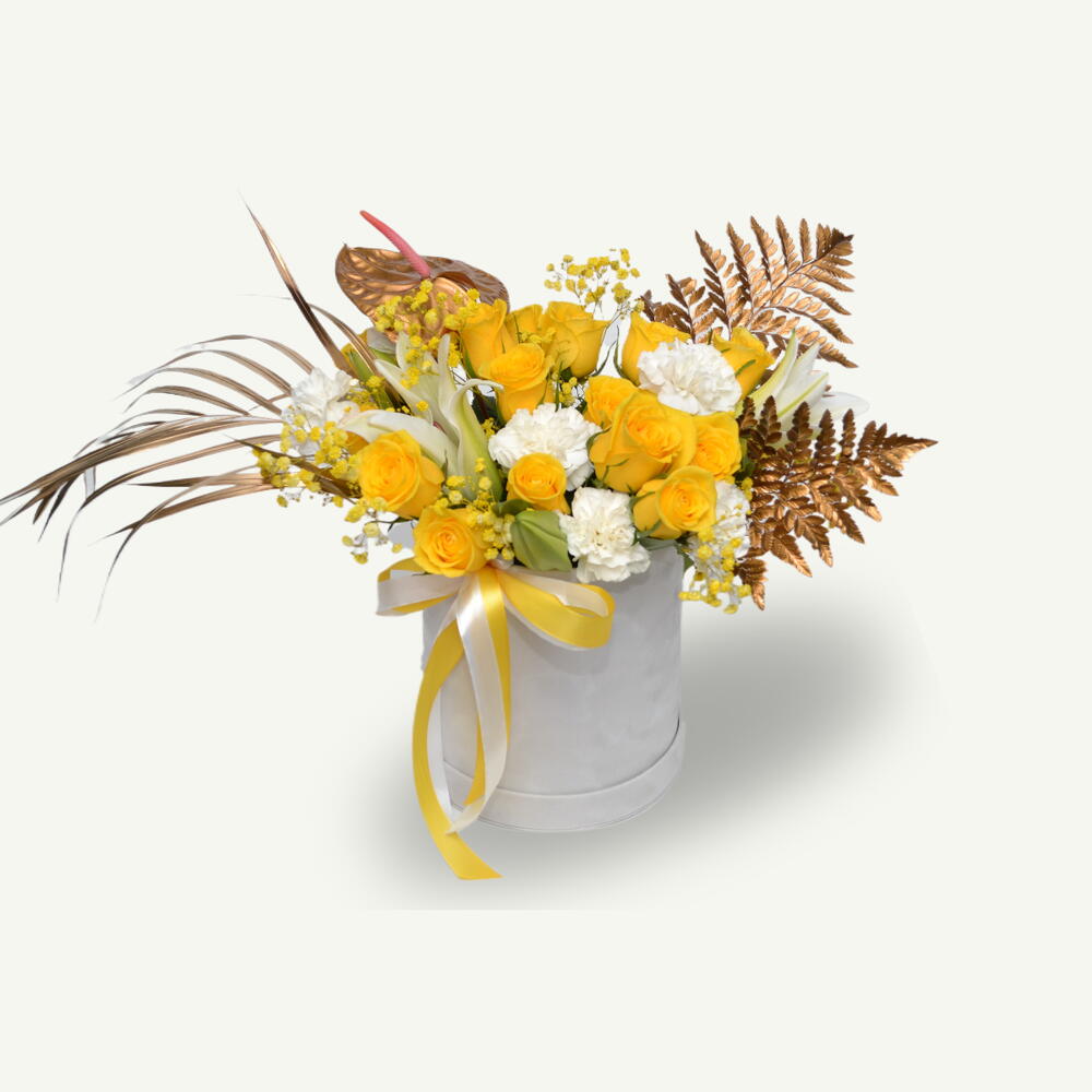 Un mélange de 20–25 roses jaunes, 10 œillets blancs, 2 tiges de lys, gypsophile jaune, anthurium doré, fougère dorée et feuilles d'aréca délicatement disposé dans une boîte en velours blanc pour une présentation florale radieuse et élégante.