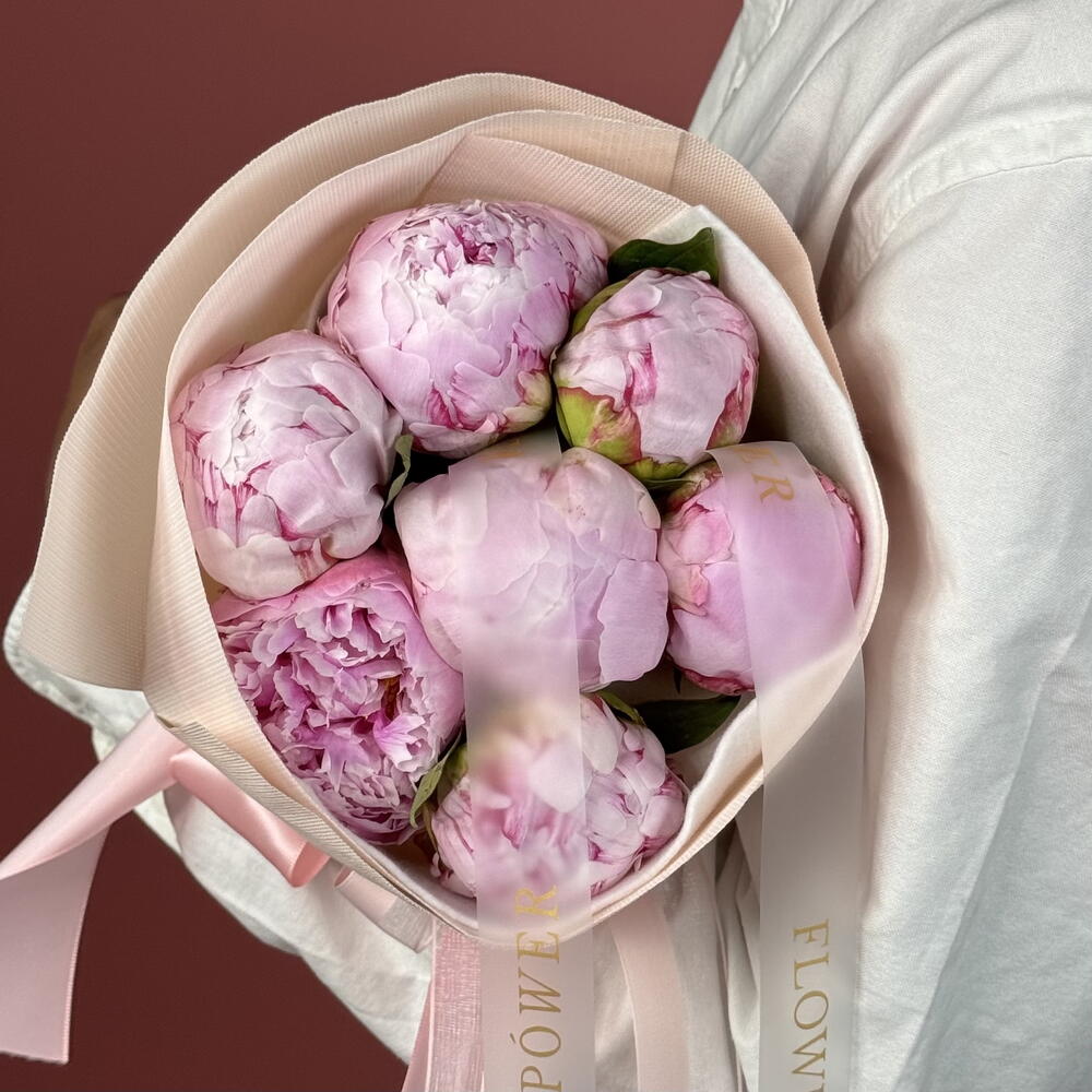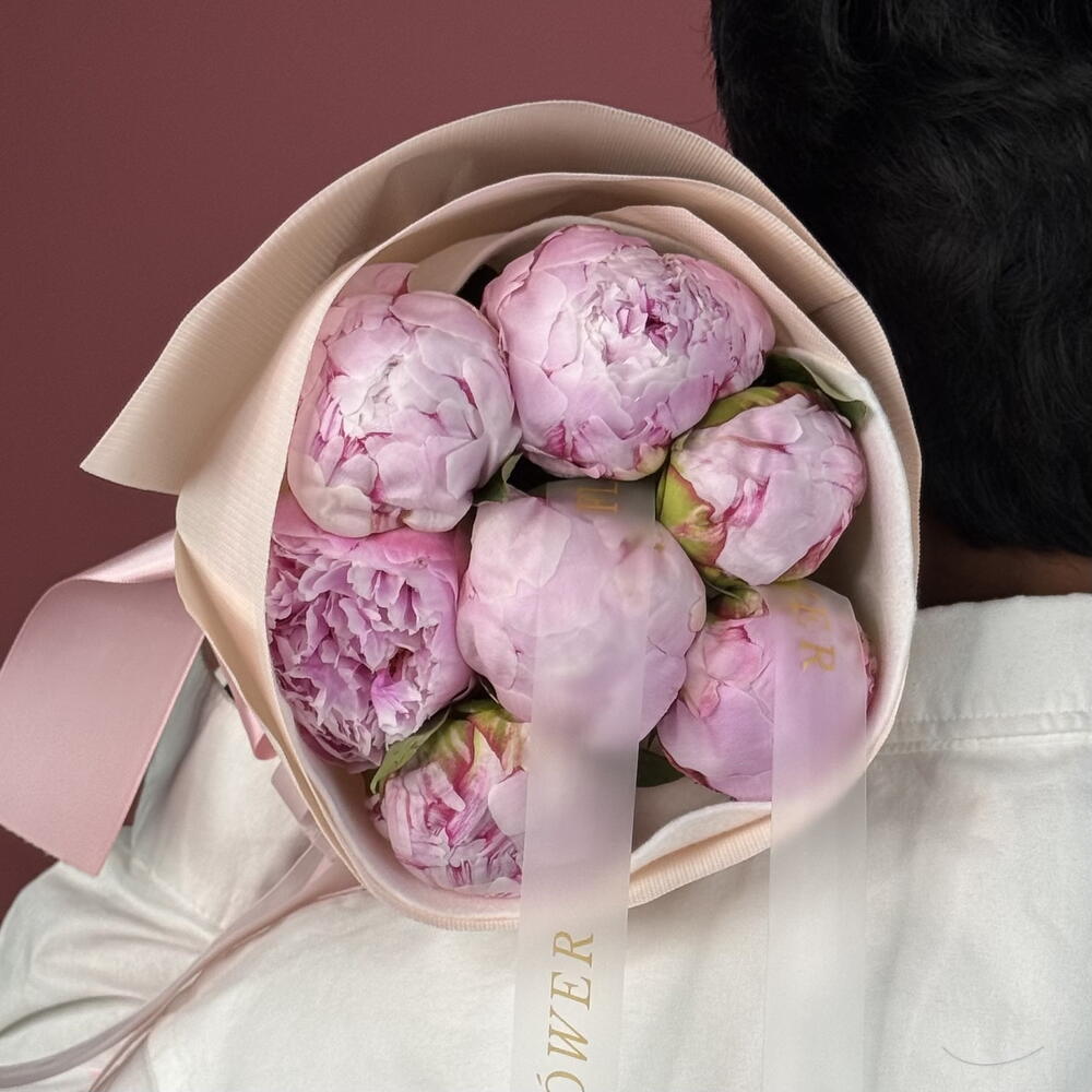 Un ravissant petit bouquet de sept pivoines luxuriantes, incarnant l'essence du romantisme classique et d'une tendre affection. Parfait pour exprimer une douce admiration et de la joie lors des anniversaires, comme un geste spontané « juste parce que », ou pour égayer un anniversaire.
