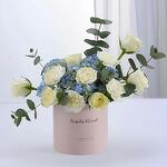 Alliant la sérénité des roses blanches fraîches, des œillets délicats et des hortensias d'un bleu doux, cet élégant arrangement floral dégage joie, paix et positivité. Conçu avec soin pour célébrer les moments forts et les réussites, ce magnifique coffret floral est le moyen idéal d'envoyer des félicitations sincères et de partager la joie d'une étape importante.