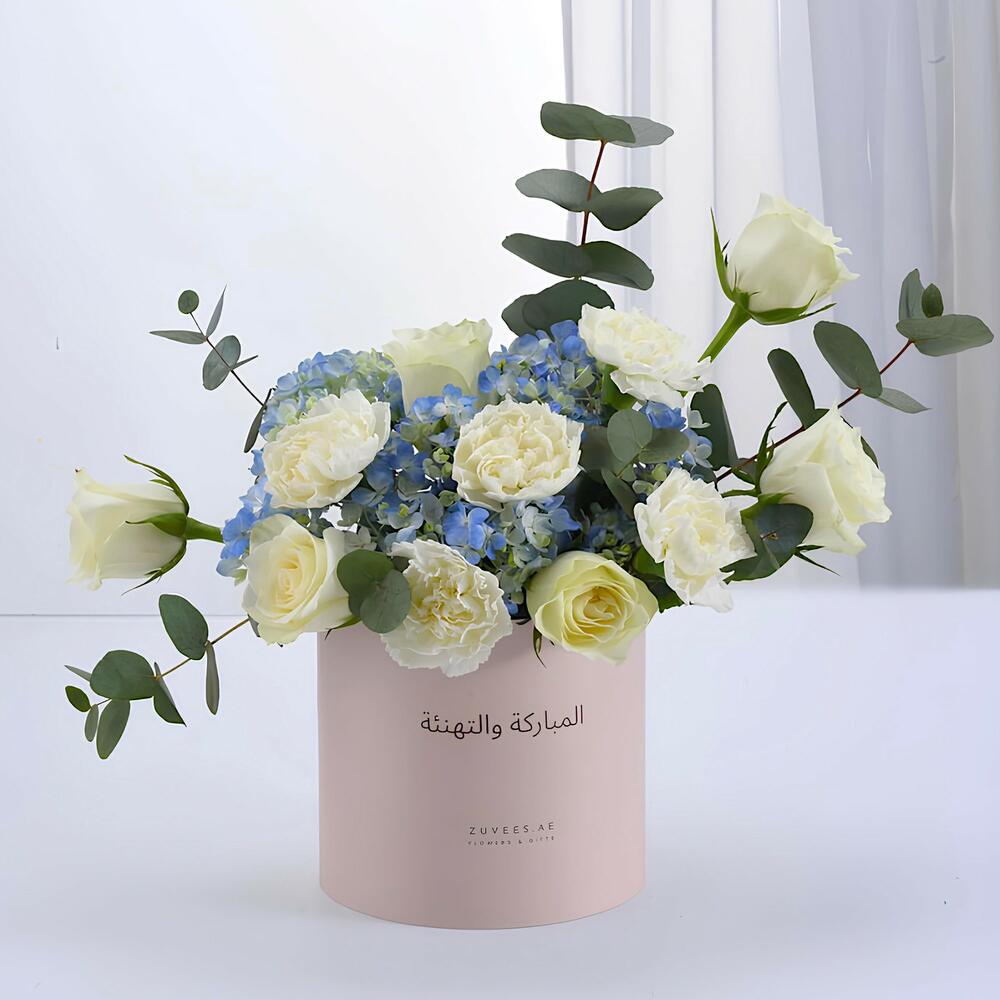 Alliant la sérénité des roses blanches fraîches, des œillets délicats et des hortensias d'un bleu doux, cet élégant arrangement floral dégage joie, paix et positivité. Conçu avec soin pour célébrer les moments forts et les réussites, ce magnifique coffret floral est le moyen idéal d'envoyer des félicitations sincères et de partager la joie d'une étape importante.