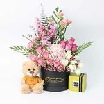 Product Details: Deluxe Patchi Chocolates 250gm Box, You Are Amazing Teddy Bear 20cm, 1 Pink Hydrangea, 7 Pink Roses, 7 White Roses, 4 Purple Roses, 3 Pink Matthiola, 4 Pink Carnations, 2 Stems Pink Wax, Leaves and Fillers - 3 Areca Palm, 2 Eucalyptus Flexi Grass and Gypso, Prepared in a Black Round Box.