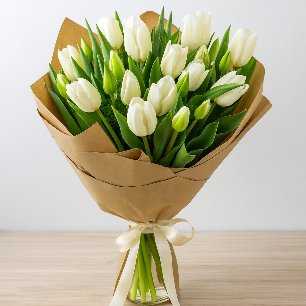 Le bouquet est vendu sans vase. Ce magnifique bouquet de tulipes d'un blanc immaculé respire la grâce et la pureté intemporelles. Soigneusement arrangé et emballé dans du papier kraft écologique, il est orné d'un doux ruban de satin pour une finition naturelle et élégante. Chaque fleur symbolise un nouveau départ, ce qui en fait le cadeau idéal pour un mariage, un anniversaire ou une excuse sincère. Les feuilles vertes fraîches et les délicats pétales blancs créent une harmonie visuelle sereine et sophistiquée. Simple mais percutant, cet arrangement est une véritable célébration de la beauté dans sa forme la plus raffinée. Laissez votre message d'amour, de paix ou de reconnaissance s'épanouir avec ce bouquet radieux.