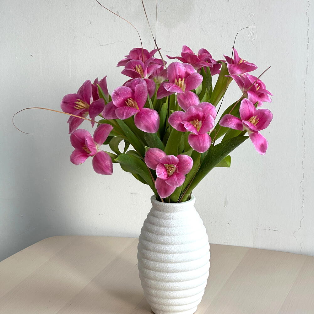 "Charme Tulipe Rosée | 15 tulipes roses dans un élégant pot blanc – cadeau floral frais et moderne"