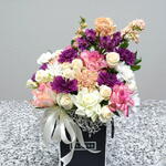 Ce somptueux arrangement floral présente un mélange harmonieux de blancs crémeux, de pêches douces, de violets éclatants et de roses romantiques, créant une composition riche et expressive. Parfait pour les anniversaires, la fête des Mères, les cadeaux d'entreprise, les fiançailles ou simplement pour égayer la journée de quelqu'un, il apporte sophistication et chaleur à toute occasion. De généreuses roses et roses branchues confèrent élégance et volume, tandis que les œillets ajoutent texture et de délicates touches pastel. Des chrysanthèmes d'un violet profond et des fleurs de saison aériennes créent un contraste saisissant, rendant le bouquet visuellement dynamique et captivant. Conservez la composition dans un endroit frais et veillez à ce que la mousse florale reste légèrement humide en ajoutant un peu d'eau tous les un ou deux jours. Évitez l'exposition directe au soleil ou aux sources de chaleur pour préserver la fraîcheur des fleurs. Avec un minimum d'entretien, cet arrangement restera magnifique et éclatant pendant de nombreux jours.