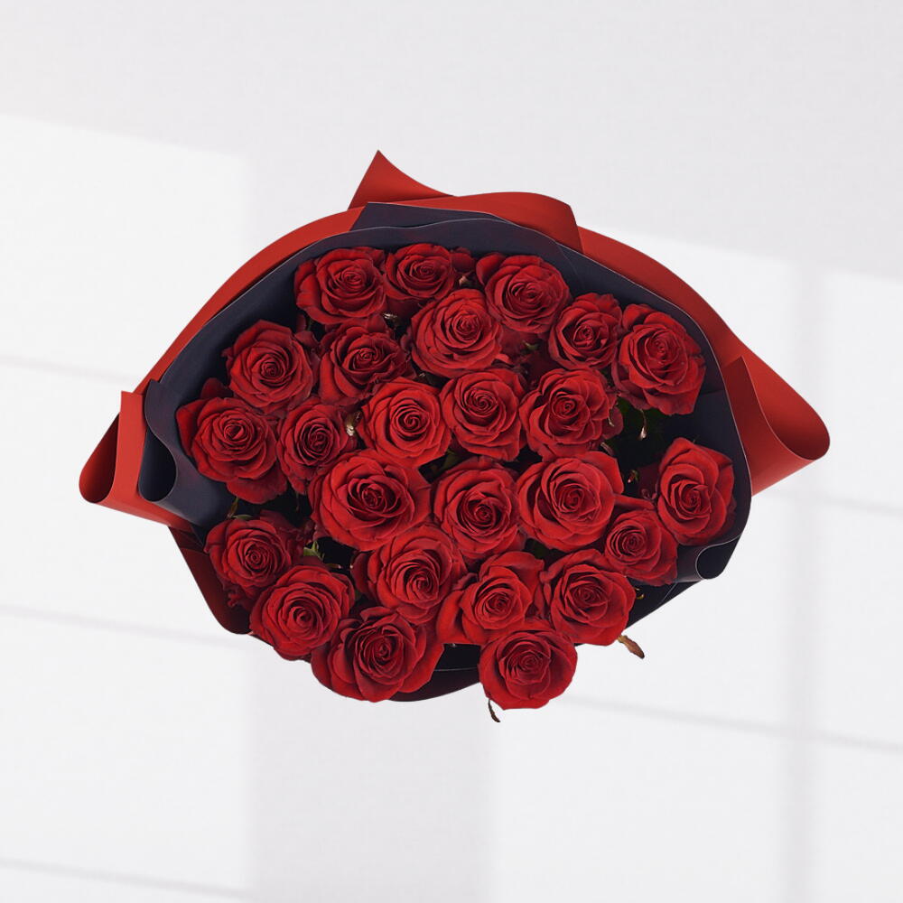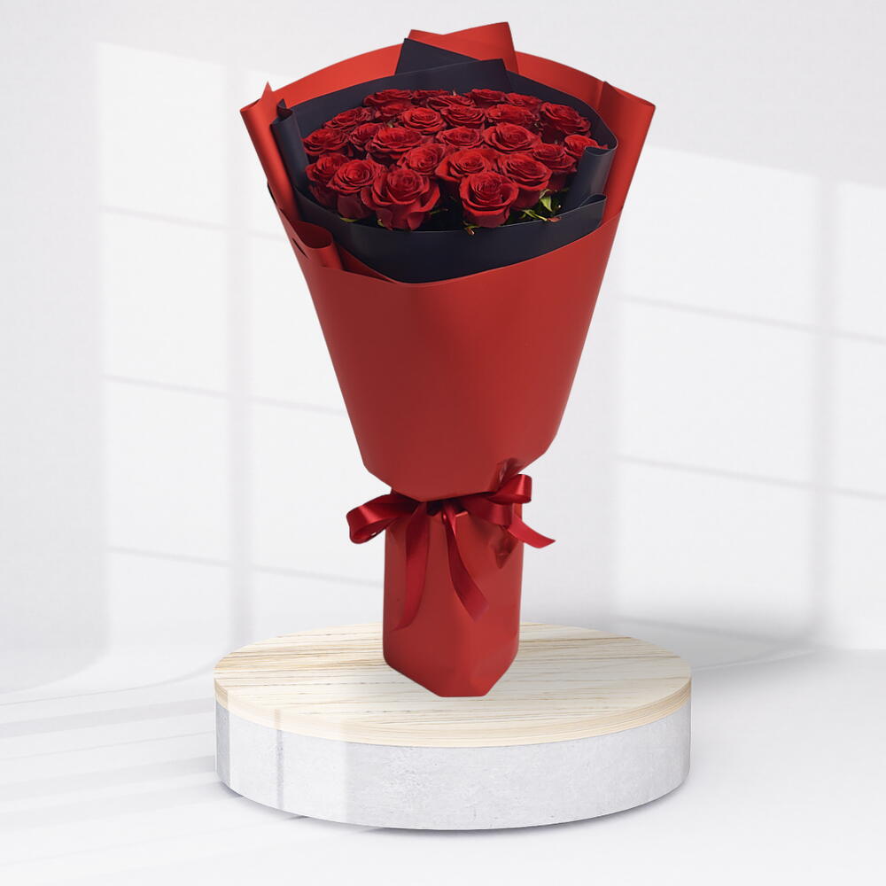 25 tiges de roses rouges avec ruban d'emballage luxueux
