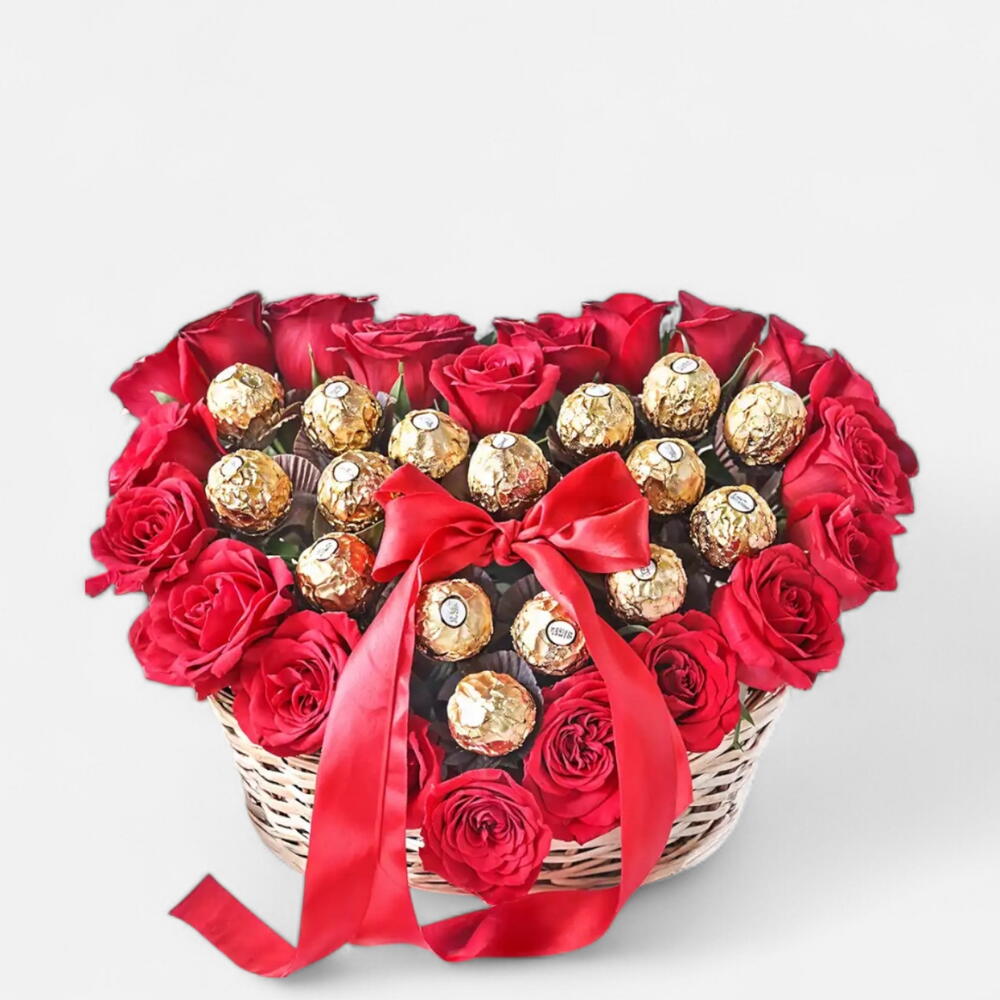 Journée de la femme Spécial_ Rose rouge Ferrero avec ballons en forme de cœur Panier-cadeau premium