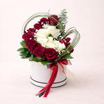 Eucalyptus - 1 pce Gypsophila - 2 pce tige de ruscus - 4 pce herbe en acier - 6 pce saule - 1 pce red roses - 8 pce mini-roses rouges - 2 pce roses blanches - 6 pce mini-roses blanches - 2 pce