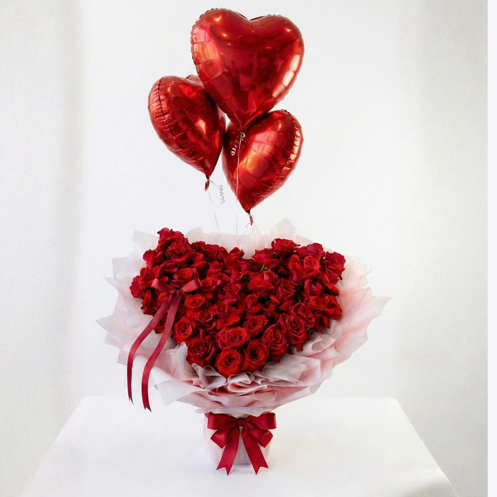 99 roses rouges en emballage rose avec 3 ballons rouges en forme de cœur à l'hélium