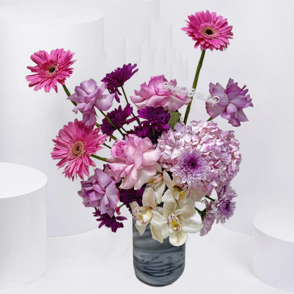 Chrysanthemum - 3 pce Gerbera - 3 pce Pink rose - 2 pce rose violette - 3 pce pink hydrangea - 1 pce bouquet de cymbidiums - 1 pce