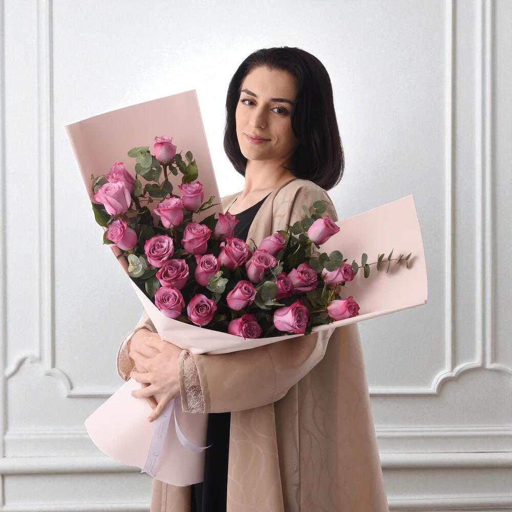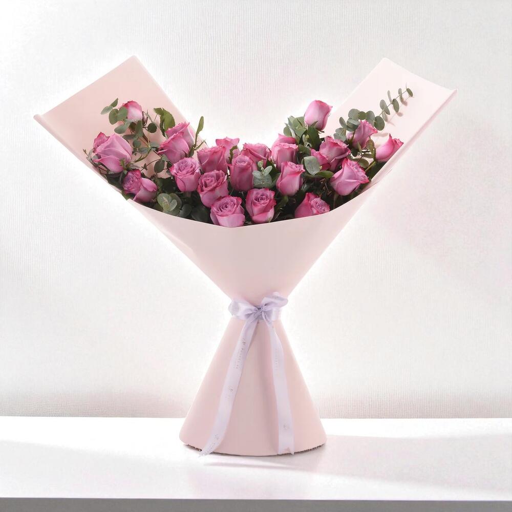 Enchantez et impressionnez avec le Bouquet de roses Violet Blush, une composition florale haut de gamme conçue pour incarner l'élégance, l'admiration et le charme romantique. Ce superbe bouquet comprend 24 luxueuses roses d'un violet profond, chacune symbolisant l'enchantement, la profondeur et un amour intense. Le bouquet est habilement rehaussé de 25 tiges d'eucalyptus aromatique et de 12 tiges de ruscus frais, créant une présentation luxuriante et texturée. Enveloppé à la main dans un papier de créateur rose poudré doux et fini par un délicat ruban en satin, ce cadeau floral est à la fois sophistiqué et saisissant — idéal pour les moments les plus émouvants de la vie.
