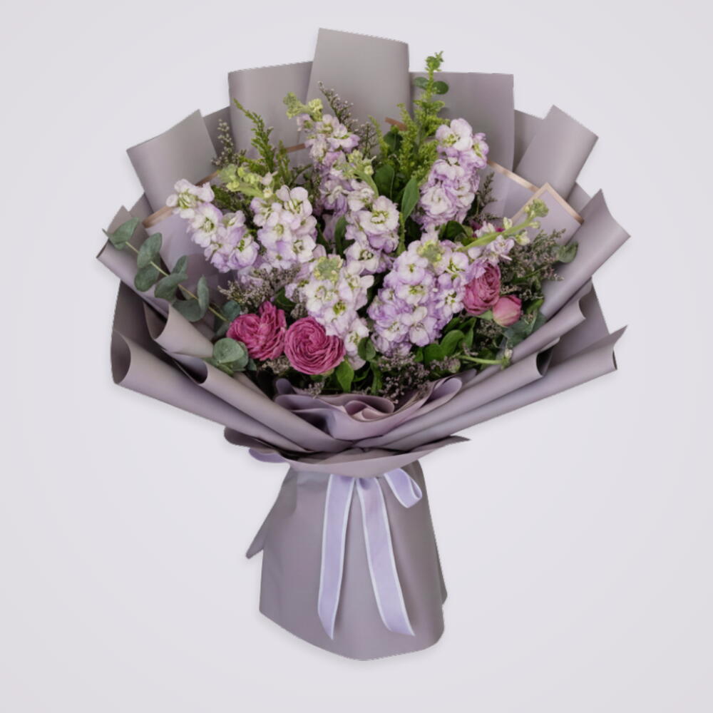 6 giroflées violettes, 4 mini-roses roses,
