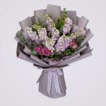 rose bébé rose - 1 pce feuilles vertes - 2 pce giroflée violette - 6 pce eucalyptus - 2 pce