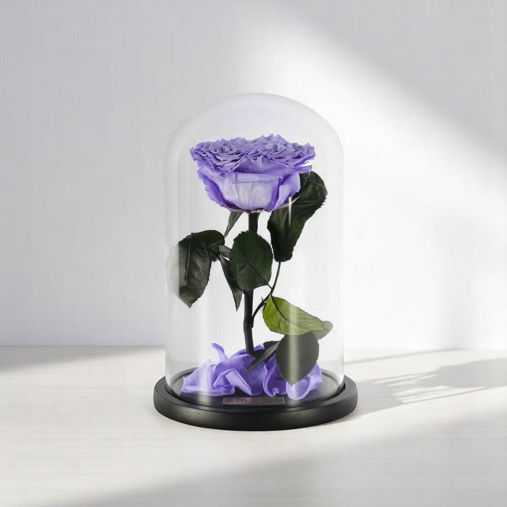 Une rose préservée à longue tige, délicatement enfermée dans un dôme en verre. Les roses sont des roses équatoriennes d'origine naturelle et approvisionnées de manière éthique, coupées à leur apogée et préservées dans des huiles naturelles. Elles peuvent conserver leur beauté exquise pendant au moins un an, et peuvent durer jusqu'à dix ans (avec des soins appropriés). Les roses ne nécessitent aucune eau et sont indiscernables de leurs équivalents frais.