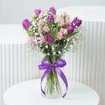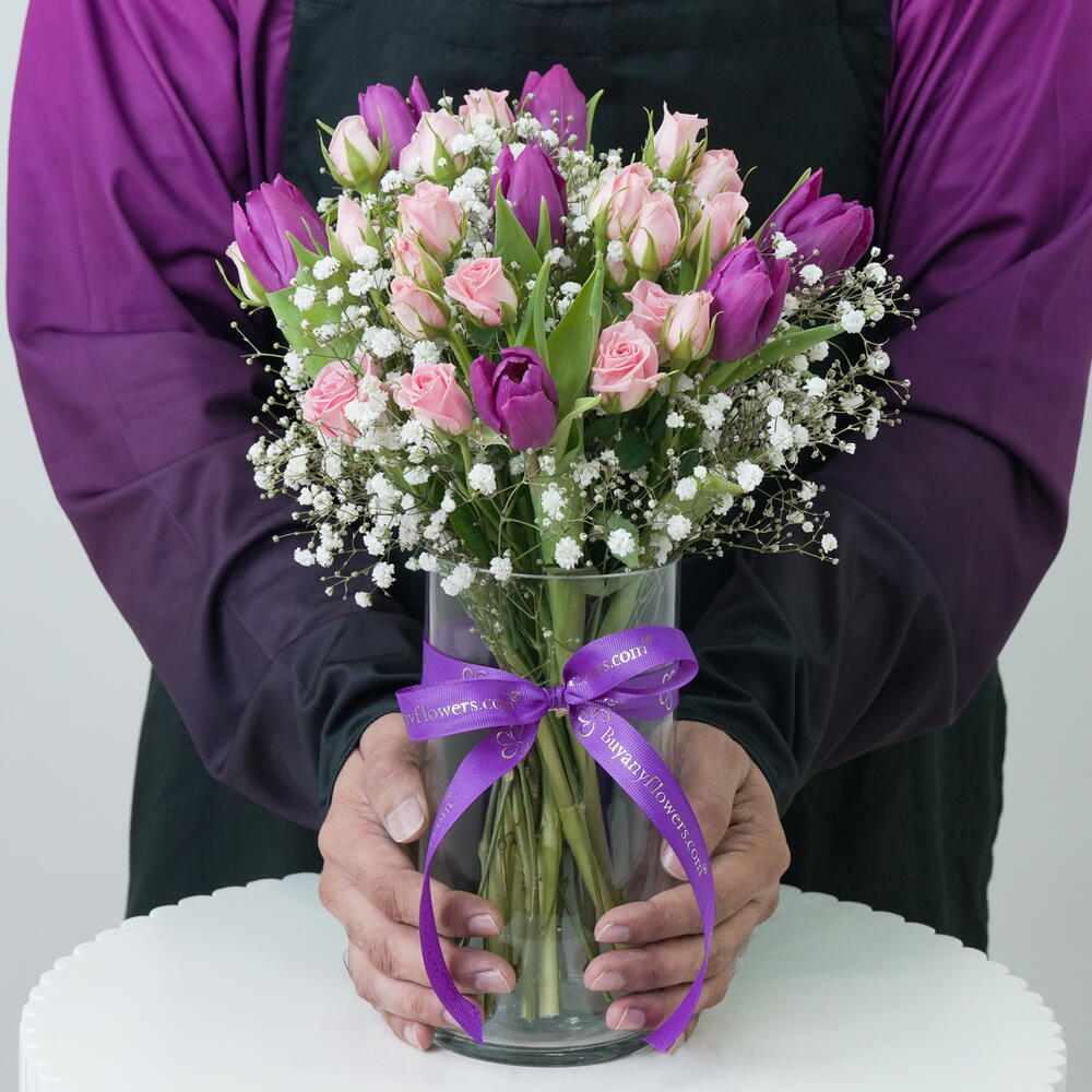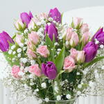 Indulge in a breath of fresh spring no matter the season with this magnificent selection from our Florists Specials. This enchanting arrangement features seven lush stems of radiant purple tulips and four stems of delicate pink baby roses arranged meticulously in a stylish 10 x 12 cm cylinder vase. The arrangement is elegantly accentuated with a single stem of white Gypsophila, lending an ethereal touch to the colorful ensemble. The bouquet is neatly tied with a purple ribbon, echoing the tulips vibrant hue and enhancing the overall presentation. This delightful assortment is a perfect choice to add a striking burst of natures beauty to your space.