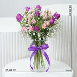 tulipes violettes - 7 pce noué d'un ruban violet - 1 pce tiges de mini-roses roses - 4 pce stem of white gypsophila - 1 pce arranged in a cylinder vase (10 × 12 cm) - 1 pce