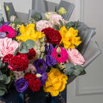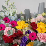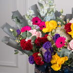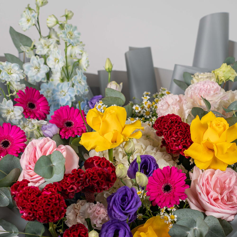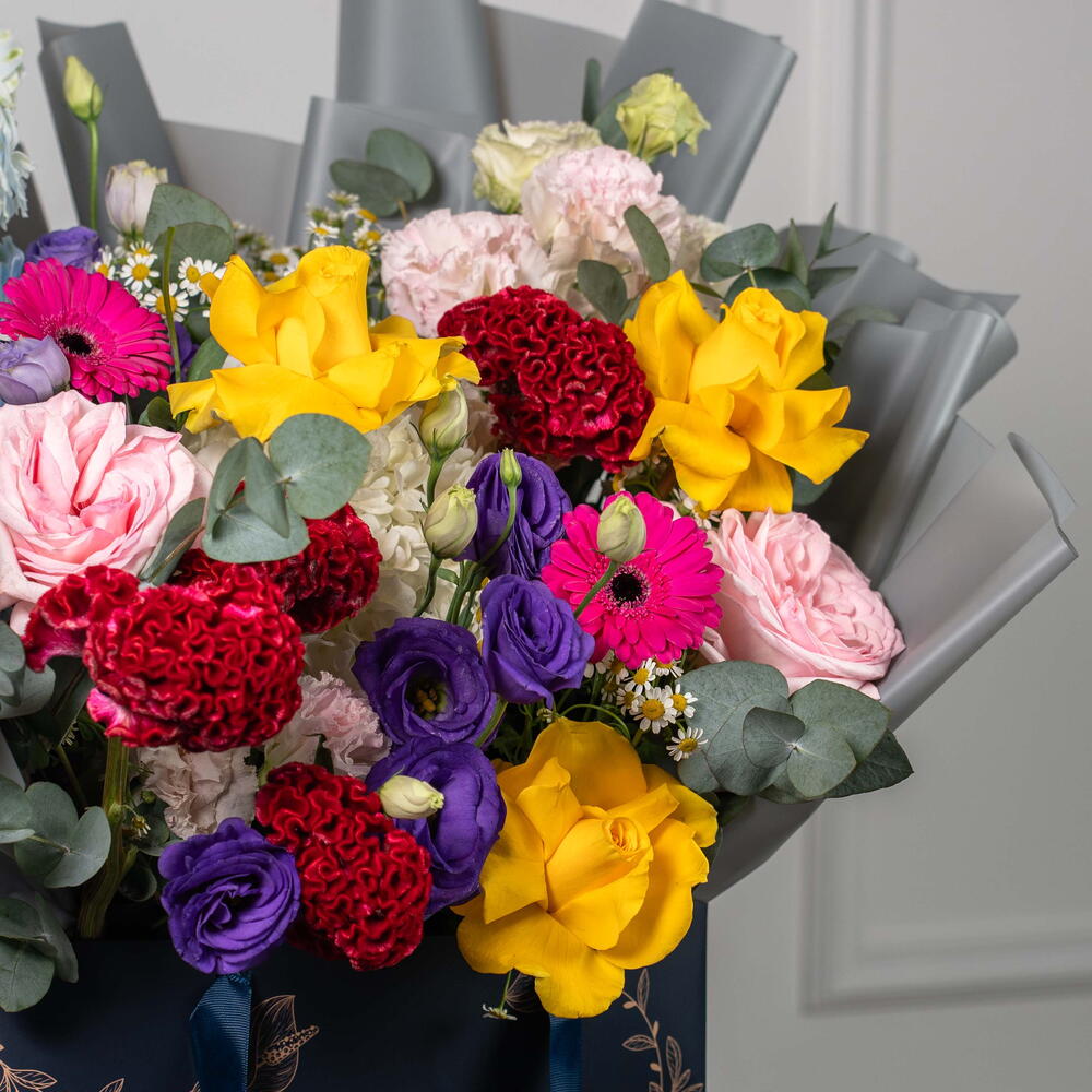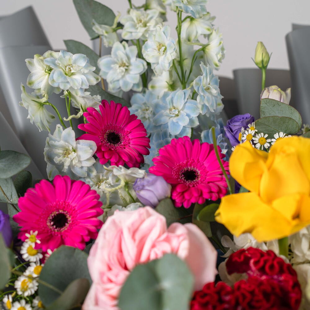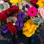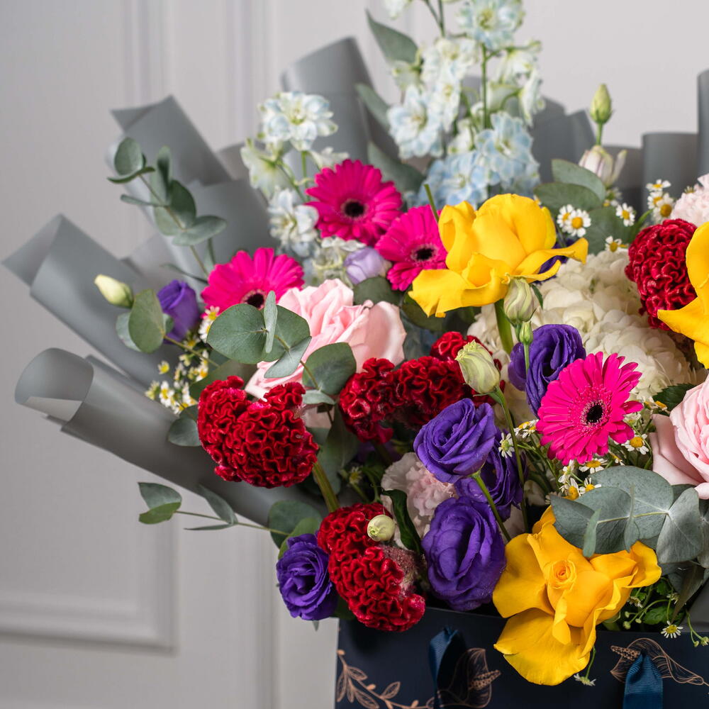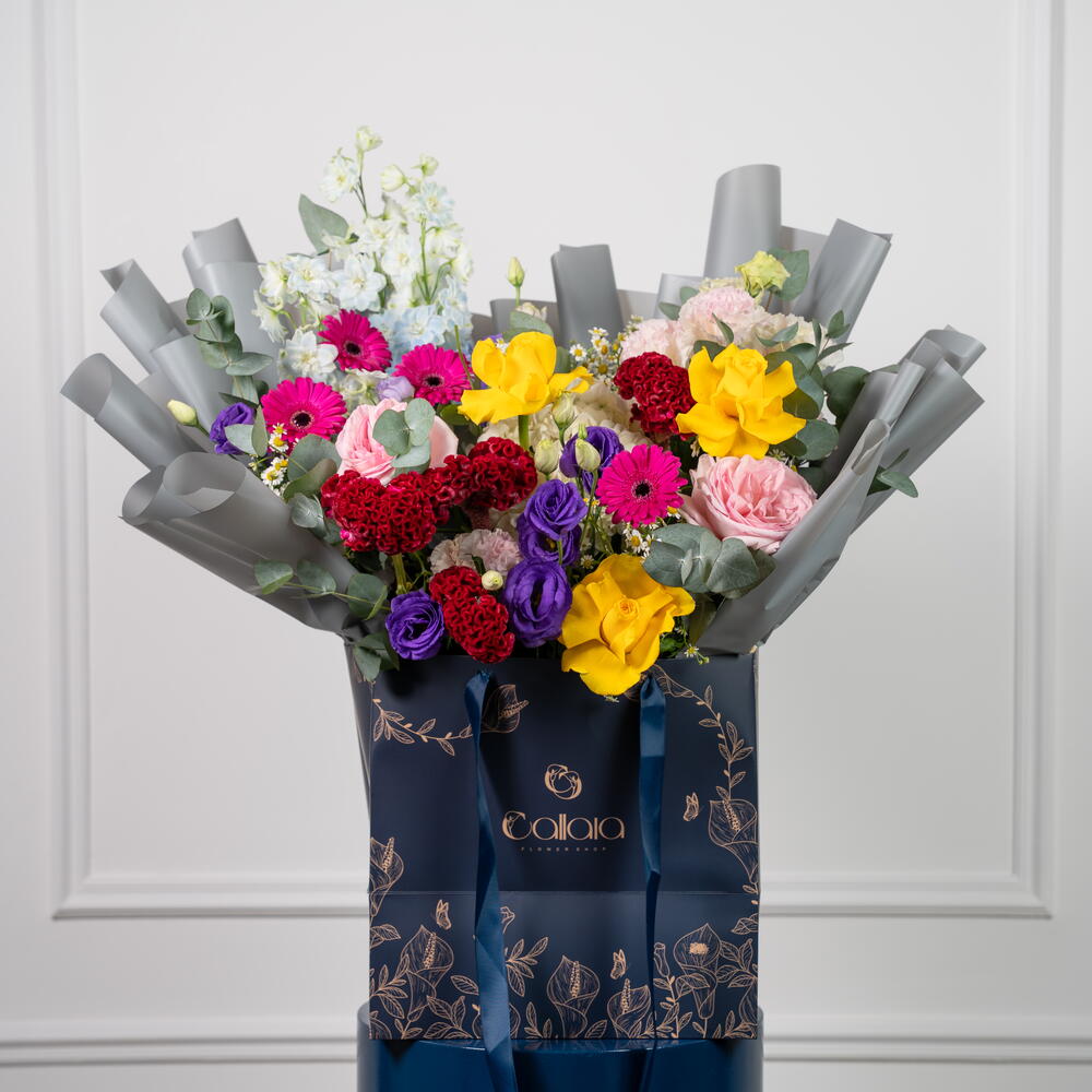 Viora – Coffret de Fleurs Mixtes Éclatantes Viora est une joyeuse célébration des couleurs, conçue pour illuminer chaque occasion avec élégance et gaieté. Cette magnifique composition est composée de germinis fuchsia, de roses jaune soleil, d'eustomas violets, de roses Ohara roses et de célosies duveteuses, sublimées par des hortensias blancs, des delphiniums bleu ciel, des tanacetums et de l'eucalyptus frais. Présentée dans le luxueux sac signature de Callaia, Viora est le choix idéal pour un cadeau audacieux et réconfortant.