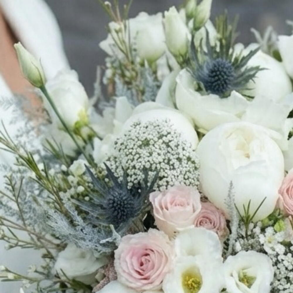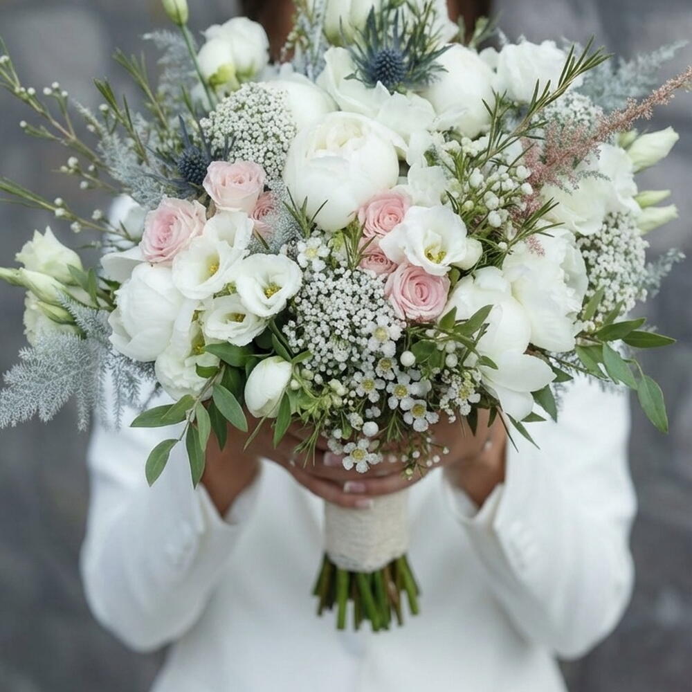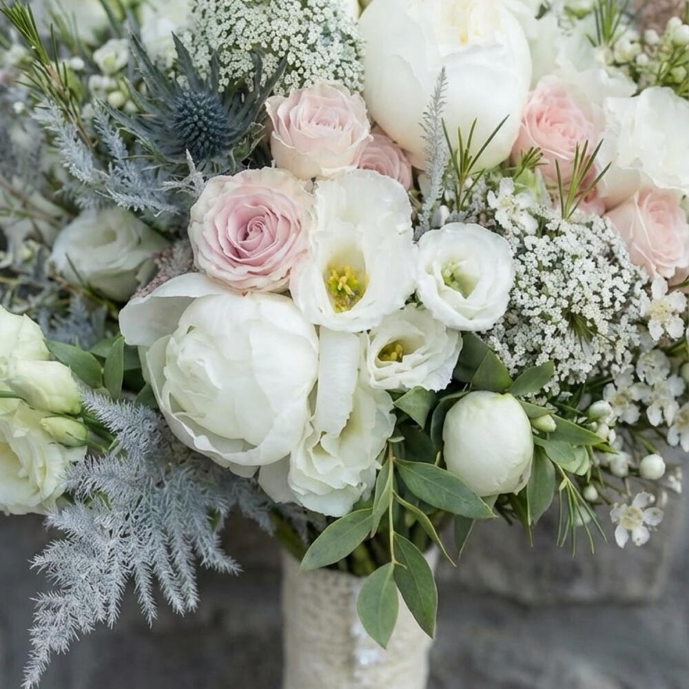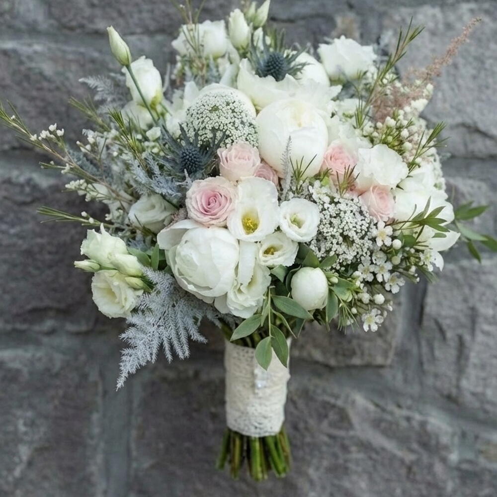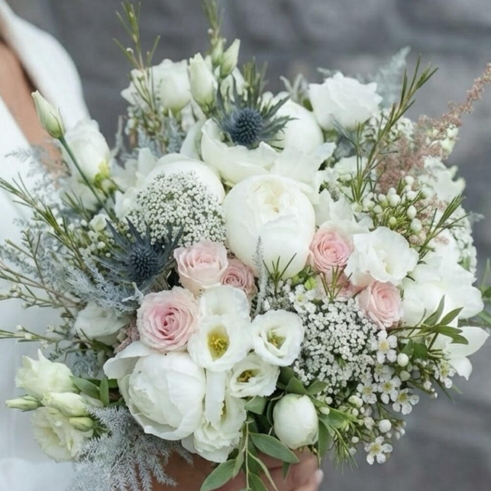 Un bouquet de mariée délicat et romantique, composé de blancs doux et de nuances rosées. Pivoines blanches, roses de jardin, lisianthus et fleurs sauvages aériennes s'entremêlent en une composition légère et élégante, empreinte de mouvement naturel et de texture douce. Ce bouquet, à la fois frais, moderne et naturel, est idéal pour une cérémonie classique, un mariage citadin chic ou une fugue amoureuse intime. — Roses et pivoines blanches — Touches rosées — Fleurs aériennes et texturées — Forme naturelle et élégante Un bouquet qui sublime votre beauté et reste intemporel sur chaque photo.