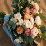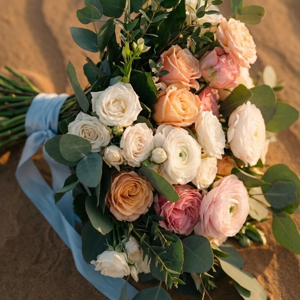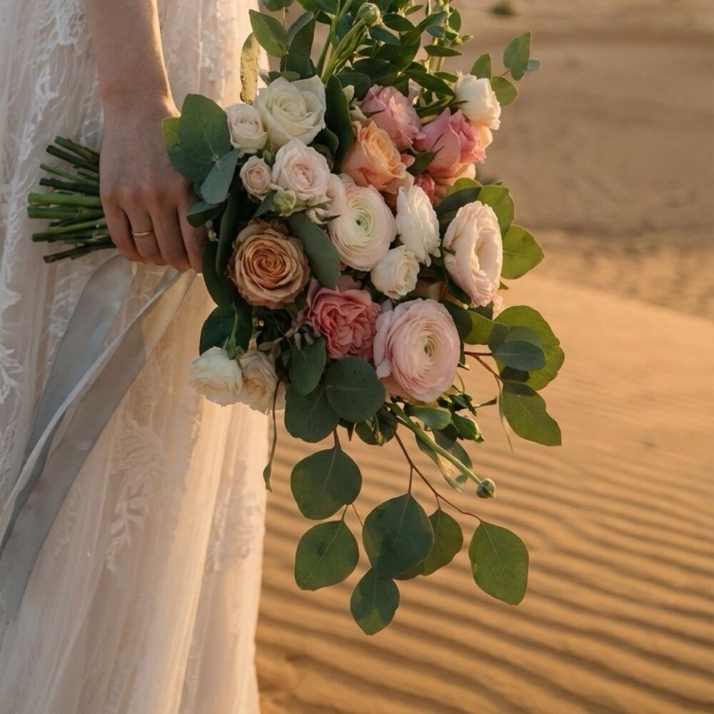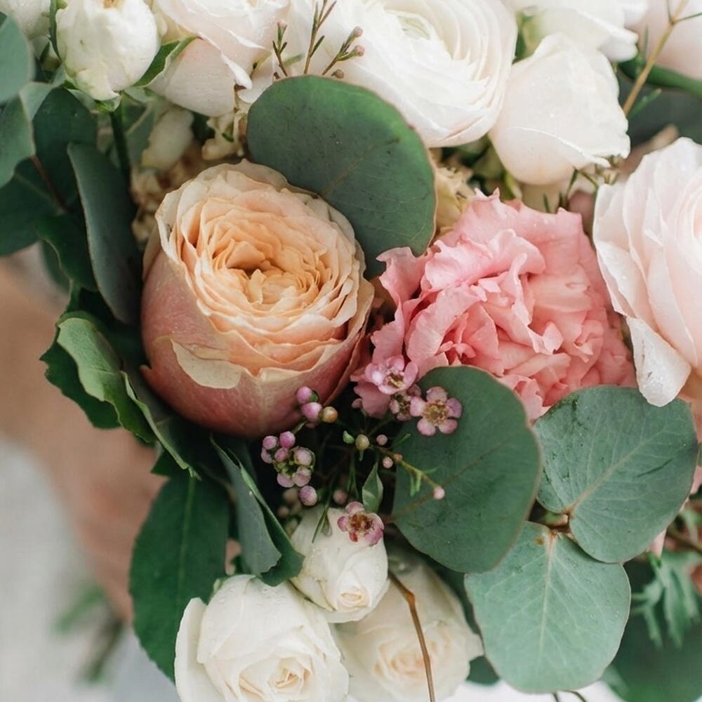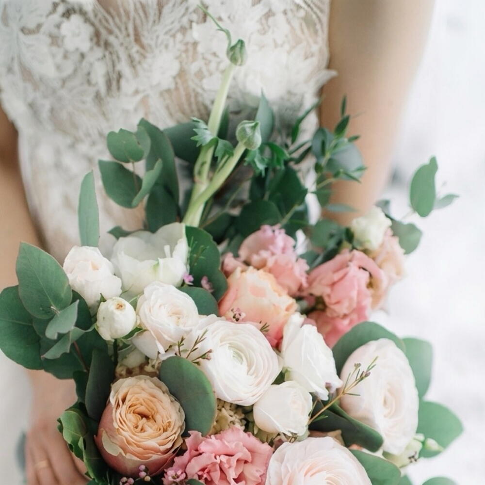 Un bouquet de mariée romantique et aérien, composé de roses de jardin, de renoncules, de lisianthus et de délicates fleurs de saison. Des nuances rose pâle et ivoire se marient à merveille avec l'eucalyptus frais, donnant au bouquet un mouvement léger et un aspect moderne et naturel. Parfait pour un mariage élégant, une cérémonie en plein air ou une célébration intime — intemporel, féminin et d'une beauté naturelle sans effort sur chaque photo. — Roses de jardin — Renoncules — Lisianthus — Fleurs de saison — Eucalyptus frais Un délicat bouquet de mariée qui est doux, gracieux et rempli d'amour.