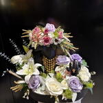 Eucalyptus - 2 pce White rose - 4 pce rose branchue rose - 3 pce rose lavande - 4 pce white lily - 2 pce bouton pompon - 2 pce blanc et or herbe blanche - 5 pce buste et main de mannequin noir - 1 pce conteneur rond noir - 1 pce