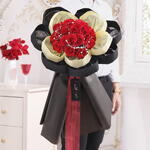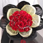 Plongez dans la splendeur de cet assortiment stupéfiant, conçu pour marquer votre journée d'amour avec peps et finesse florale. Des roses rouges, enveloppées dans des papiers de soie noirs et blanc cassé, artistiquement conçus pour ressembler à une fleur. Elles vont les séduire à coup sûr.