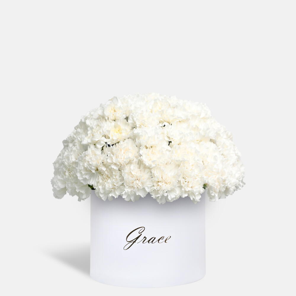 Délicatement disposés dans une boîte élégante, ces œillets blancs immaculés symbolisent l'amour pur, le souvenir et l'admiration — parfaits pour exprimer des émotions sincères lors de toute occasion spéciale ou pour un geste attentionné.