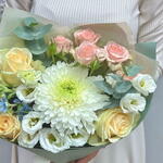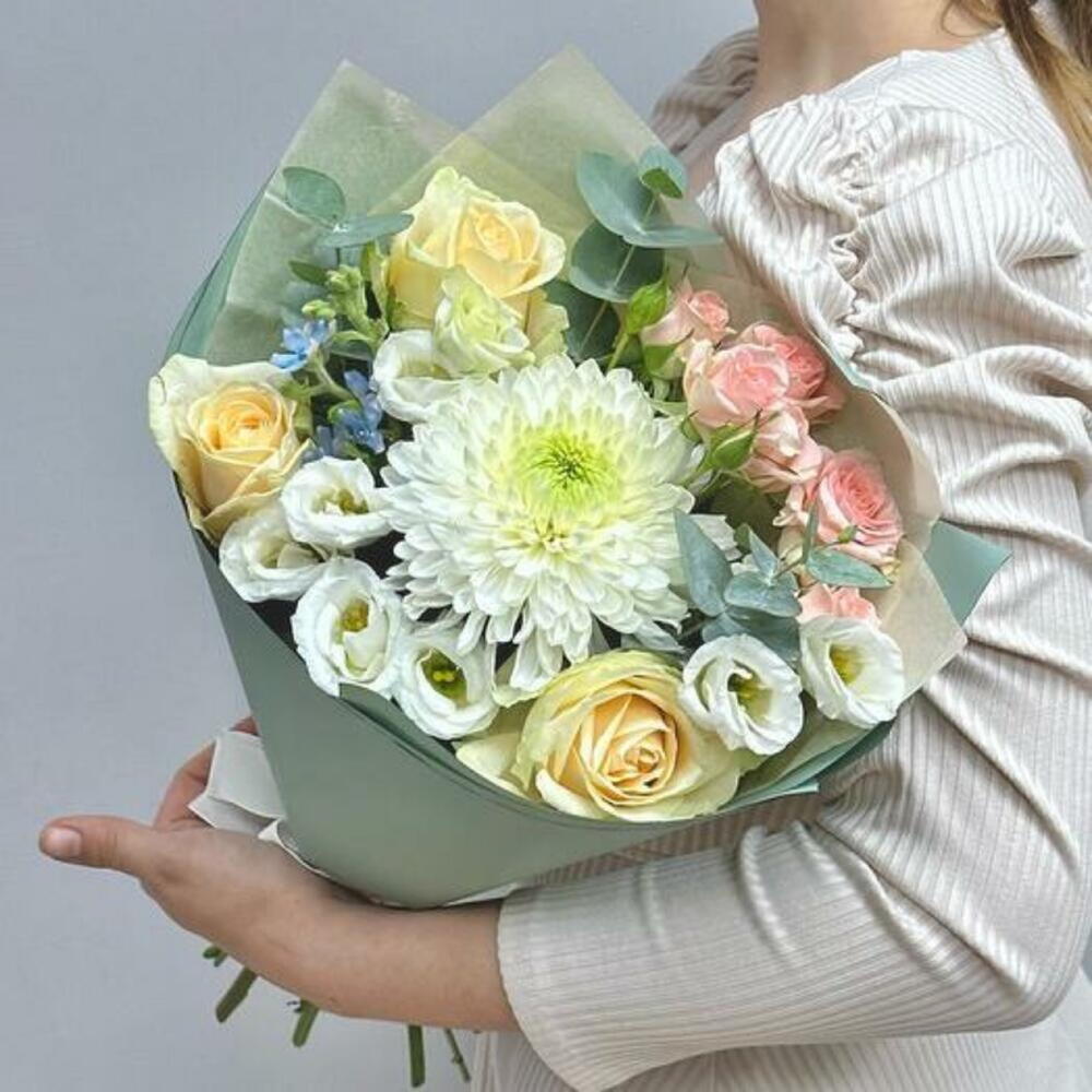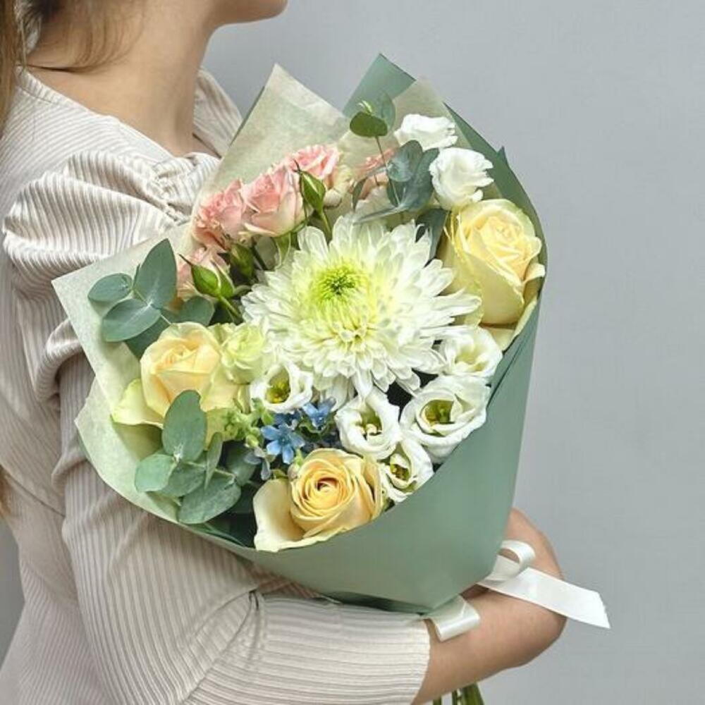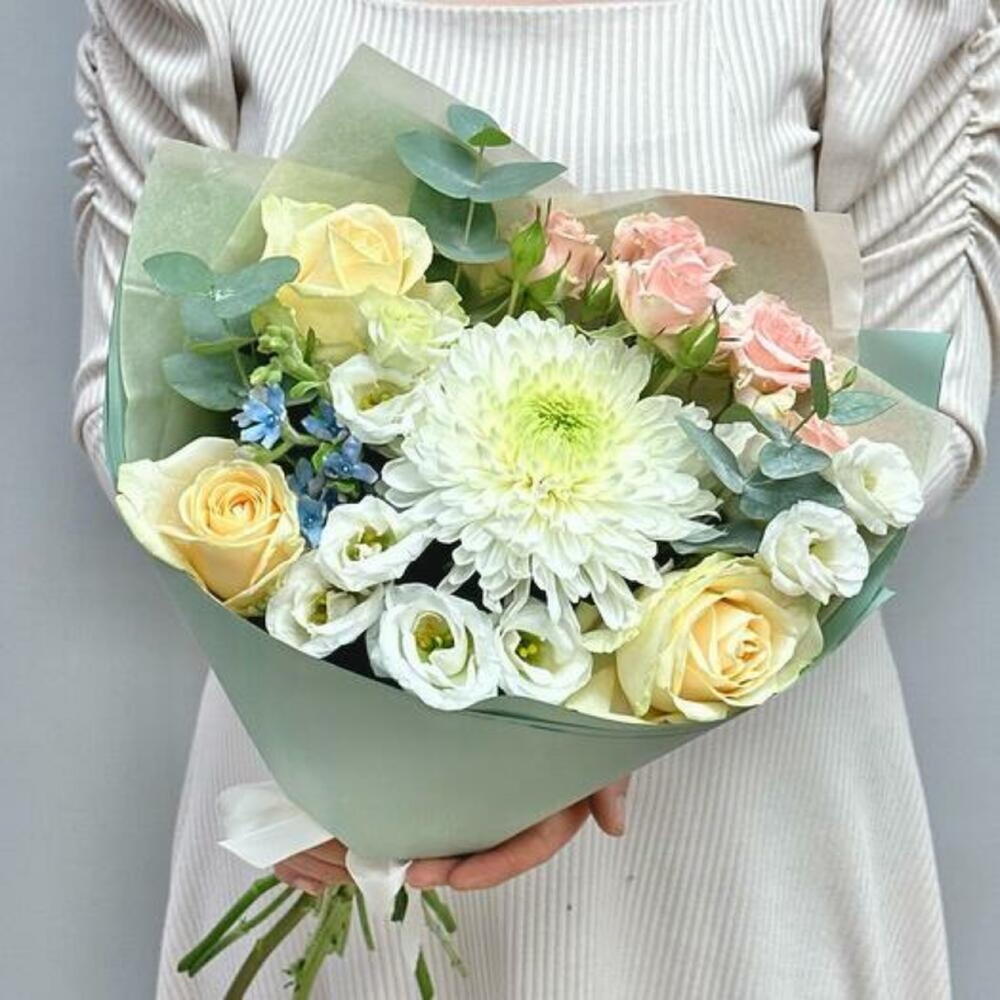 Eucalyptus - 1 pce Spray rose - 1 pce Chrysanthemum - 1 pce ribbon satin - 1 pce white eustoma - 1 pce emballage design - 1 pce oxipetalum - 1 pce