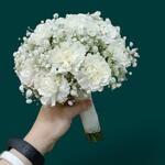 Un bouquet de mariée délicat et aérien composé d'œillets blancs immaculés entourés d'un nuage de petites gypsophiles blanches (gypsophile). Les tiges sont enveloppées d'un tissu blanc doux, créant un bouquet léger, texturé et magnifiquement romantique.