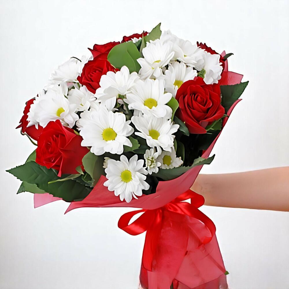 Bouquet de roses rouges fraîches 🌹 et de chrysanthèmes blancs
