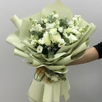fleurs blanches spéciales confectionnées en bouquet dans un emballage beige