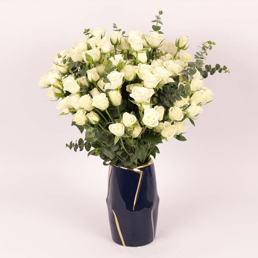 17 tiges de mini-roses blanches, 5 tiges d'eucalyptus bleu layette, préparé dans un vase en céramique premium bleu et doré - 12x20cm.